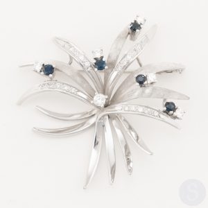 Eine Brosche in 18 Kt. Weißgold in Form eines stilisierten Zweiges mit Diamanten und Saphiren