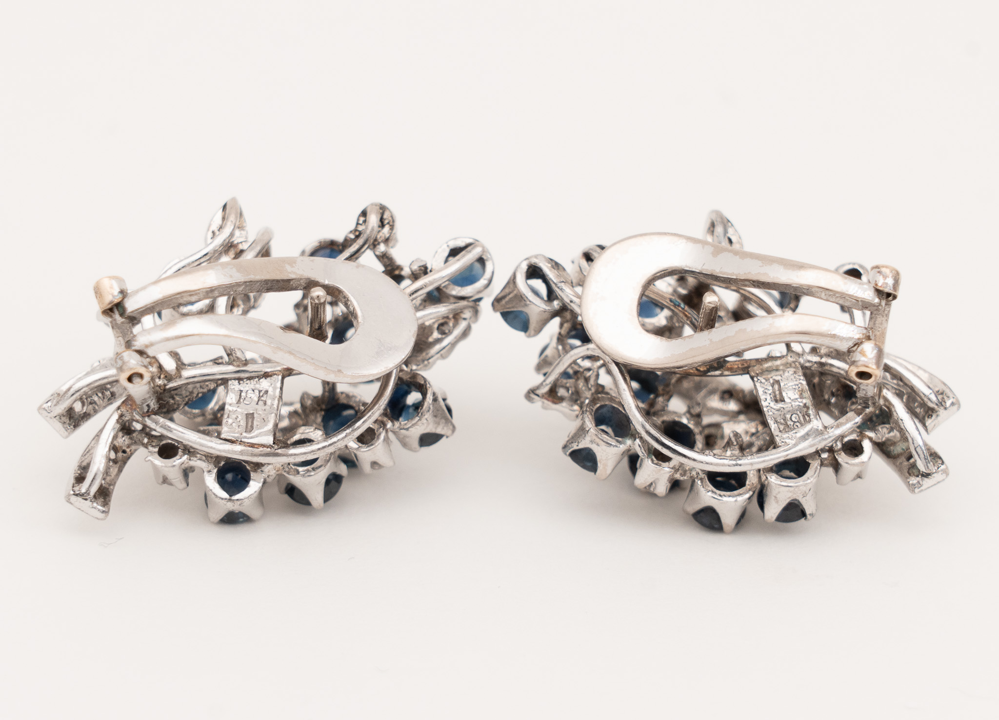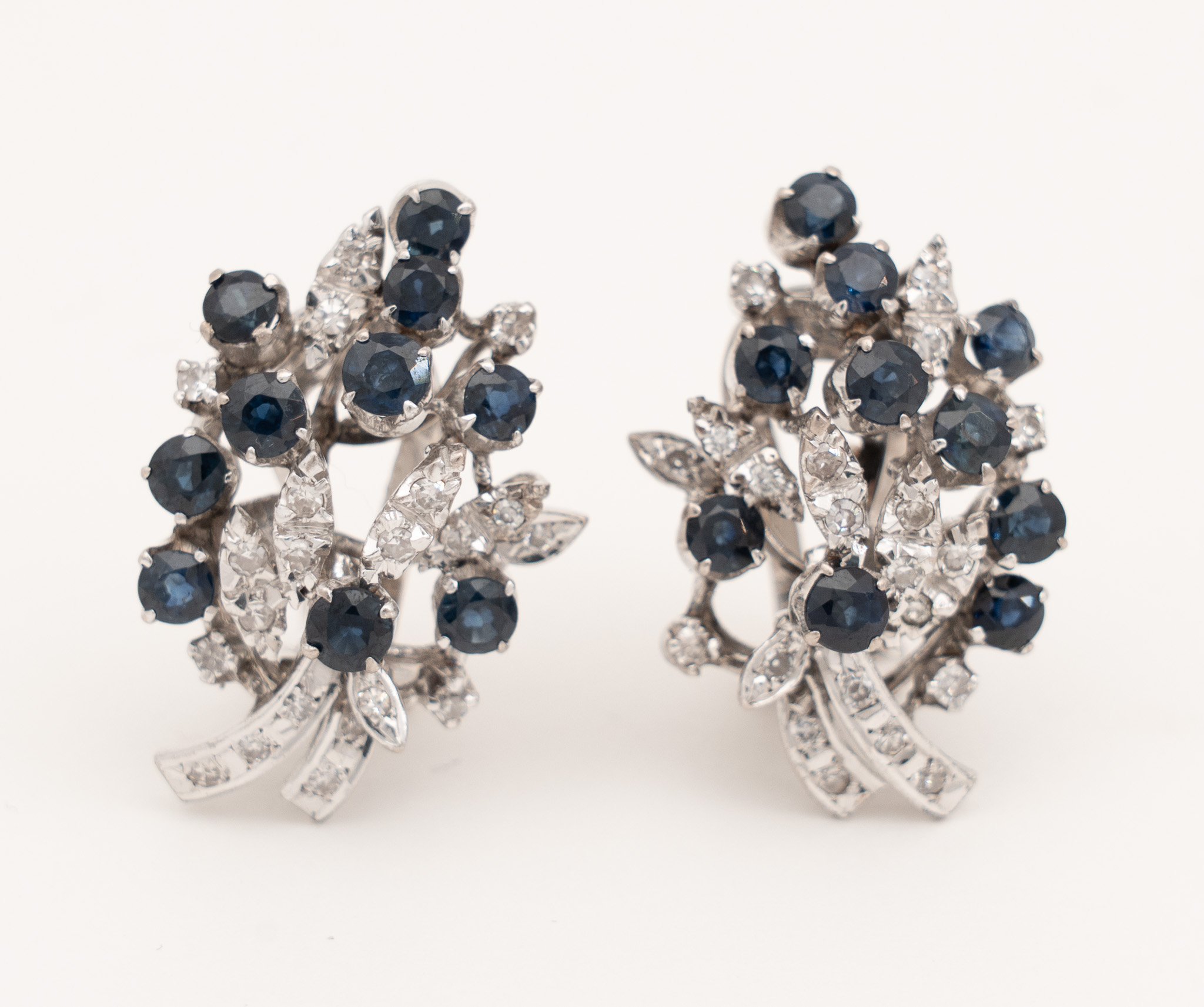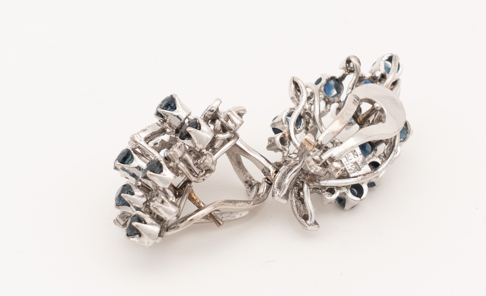 Ein Paar Ohrstecker in 18 Karat Weißgold (750/1000) mit zusammen 20 Saphiren von zusammen ca. 2,4 ct. und kleinen Diamanten. Um 1970.