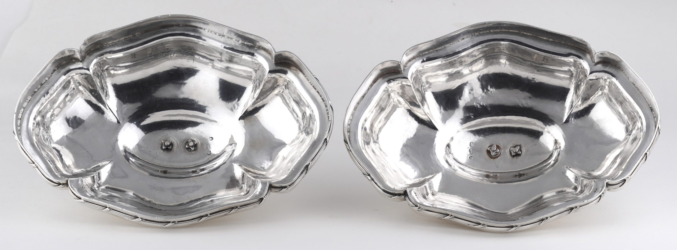 Die vierfach eingezogenen und geschweiften Cloches mit gattem hochpoliertem Dekor.