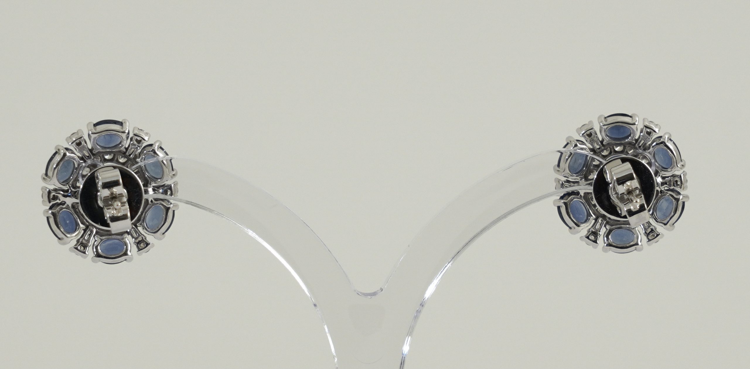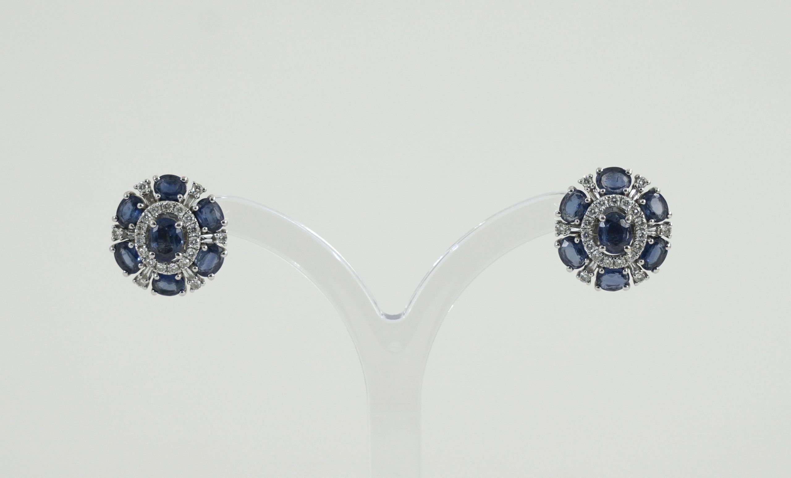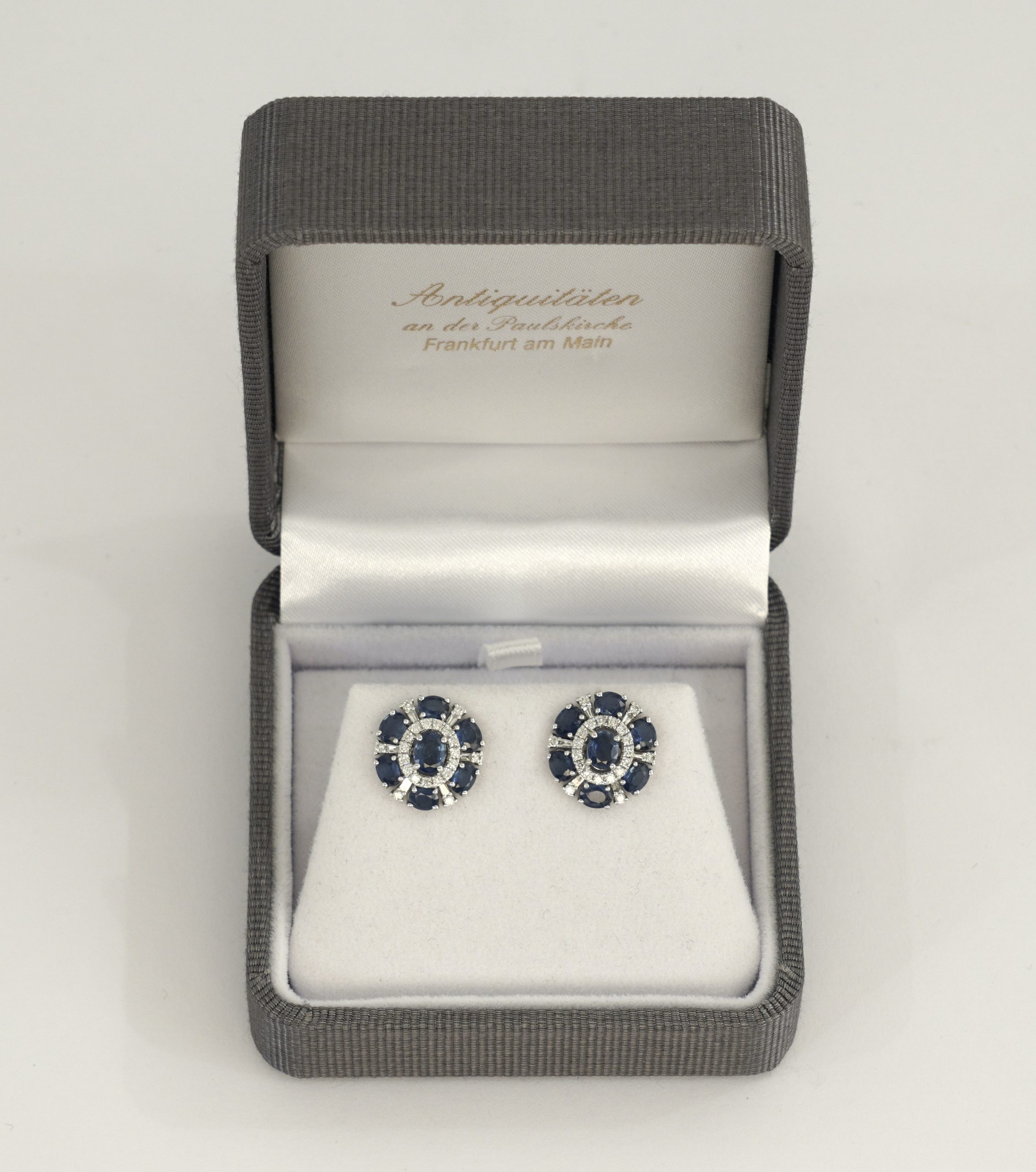 Ein Paar attraktive Saphir/Diamant Ohrstecker in 18 Karat (750/1000) Weißgold – ausgefasst mit vierzehn blauen Saphiren von zusammen ca. 3 ct. und 42 Diamanten von zusammen ca. 0,5 ct.