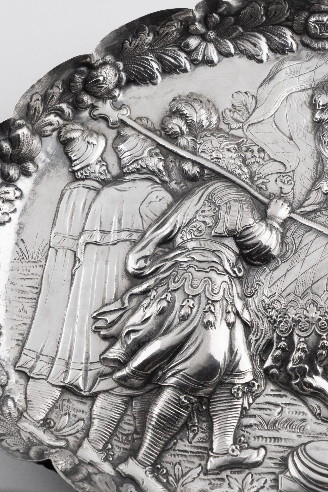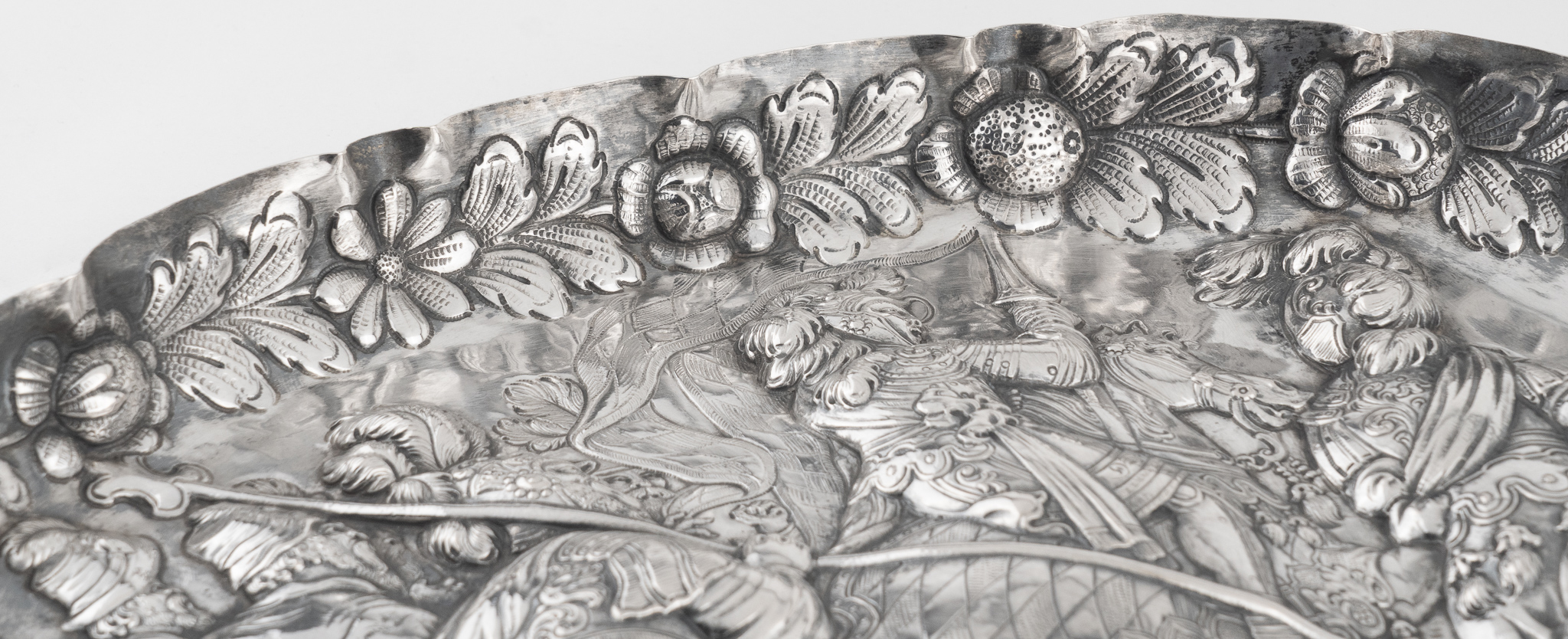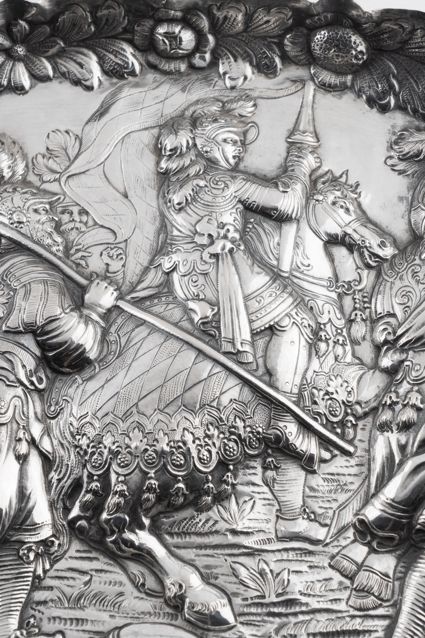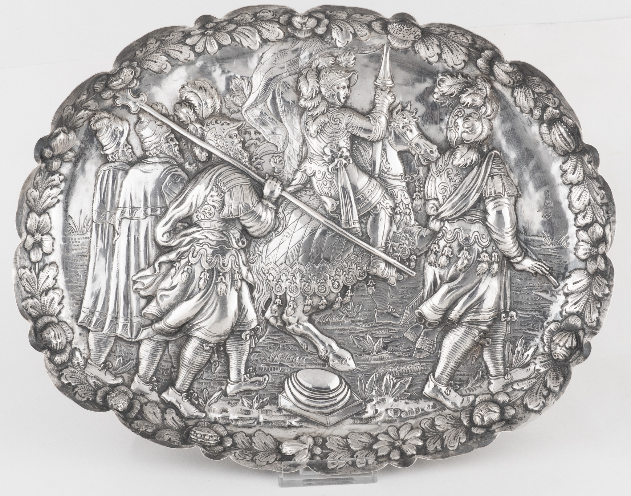 Eine fein gearbeitete Prunkschale in Silber im Stil des Historismus des 18. Jahrhundert mit einer Ritterszene (evtl. Maximilian I. der letzte Ritter)