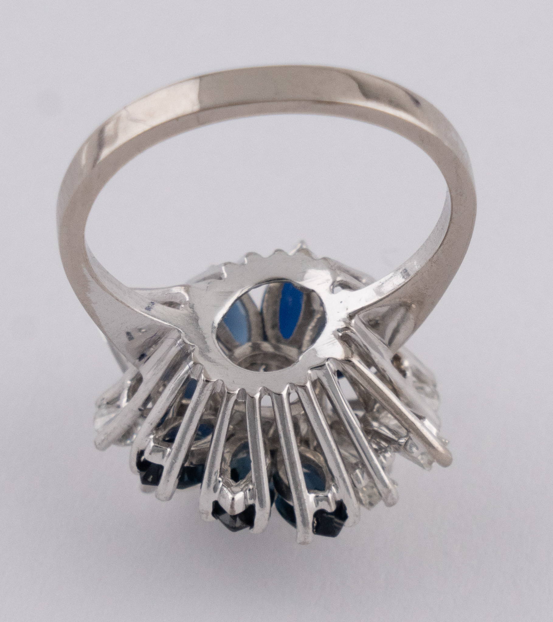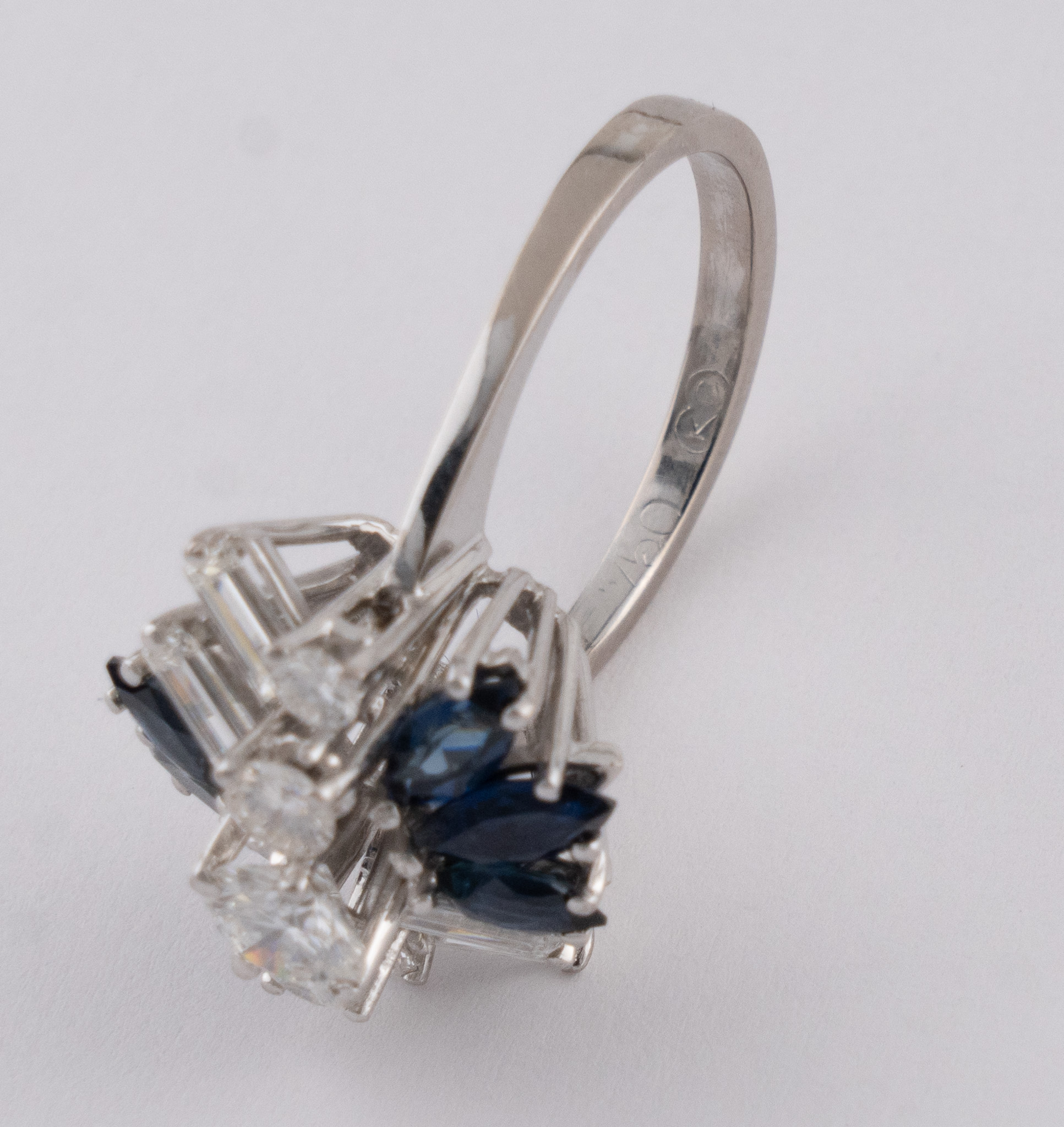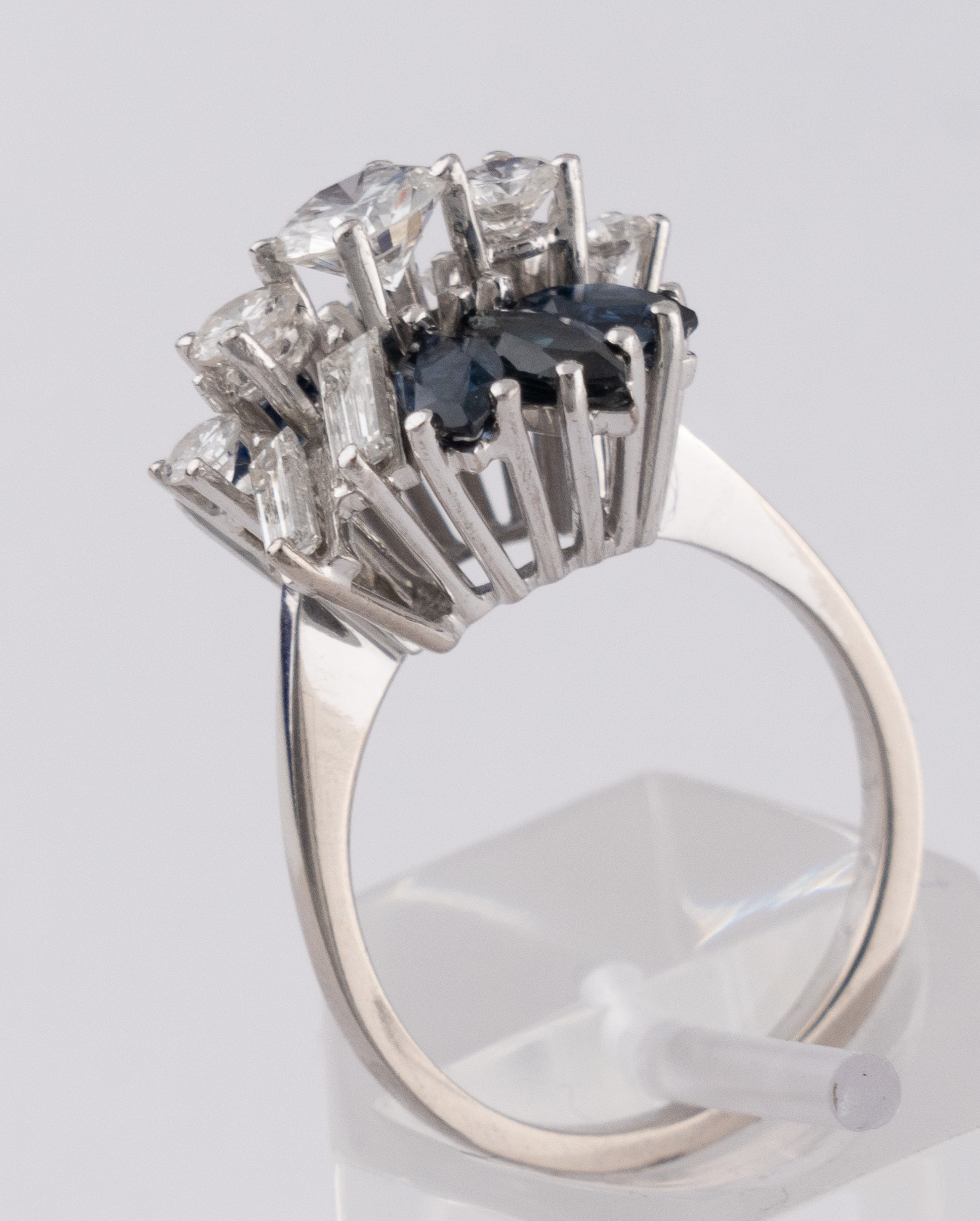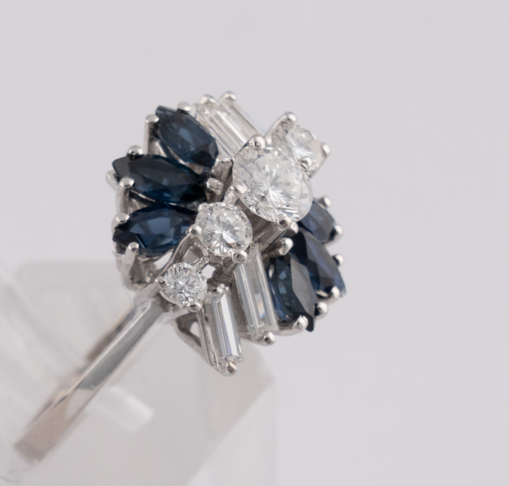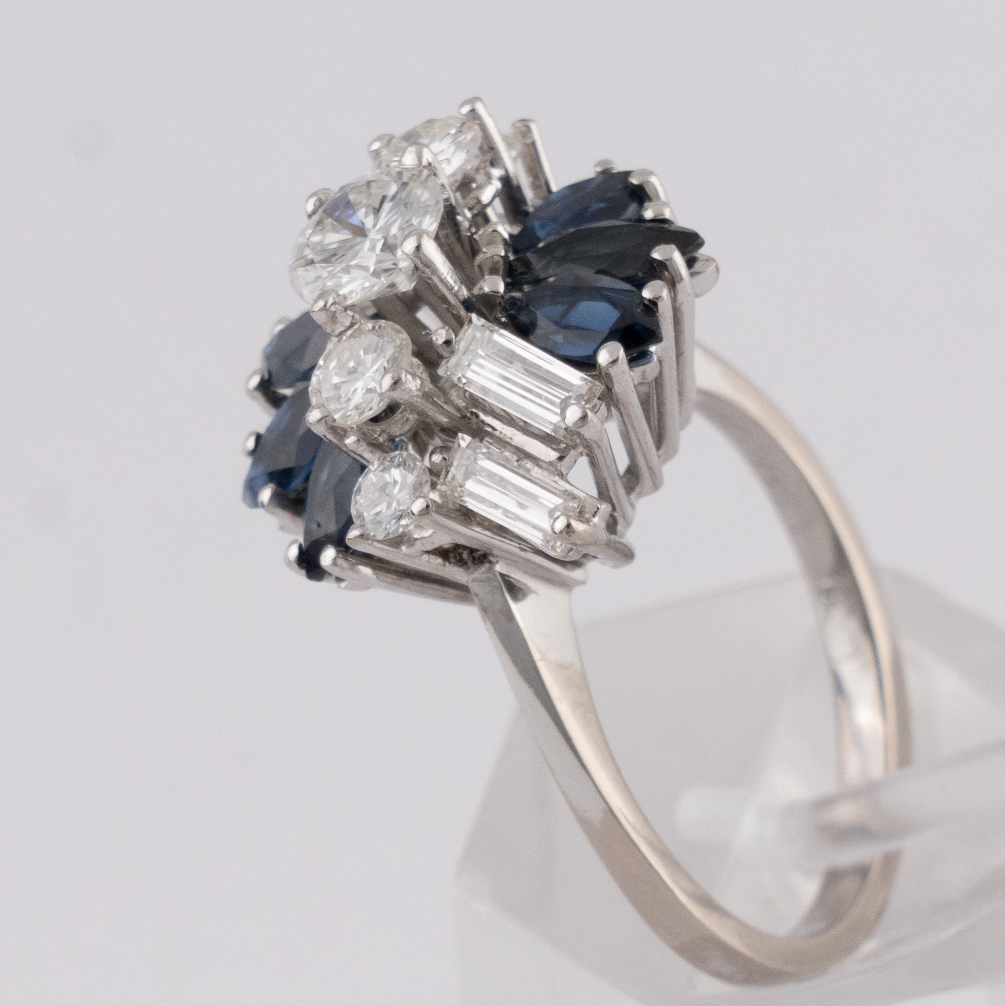 Ein Brillantring in 18 Karat. Weißgold (750/1000) mit 5 Billanten von zusammen ca. 1,27 ct. und 4 Baguette Diamanten von zus. 0,46 ct. sowie 6 Saphir Navetten von zus. ca. 0,9 ct.