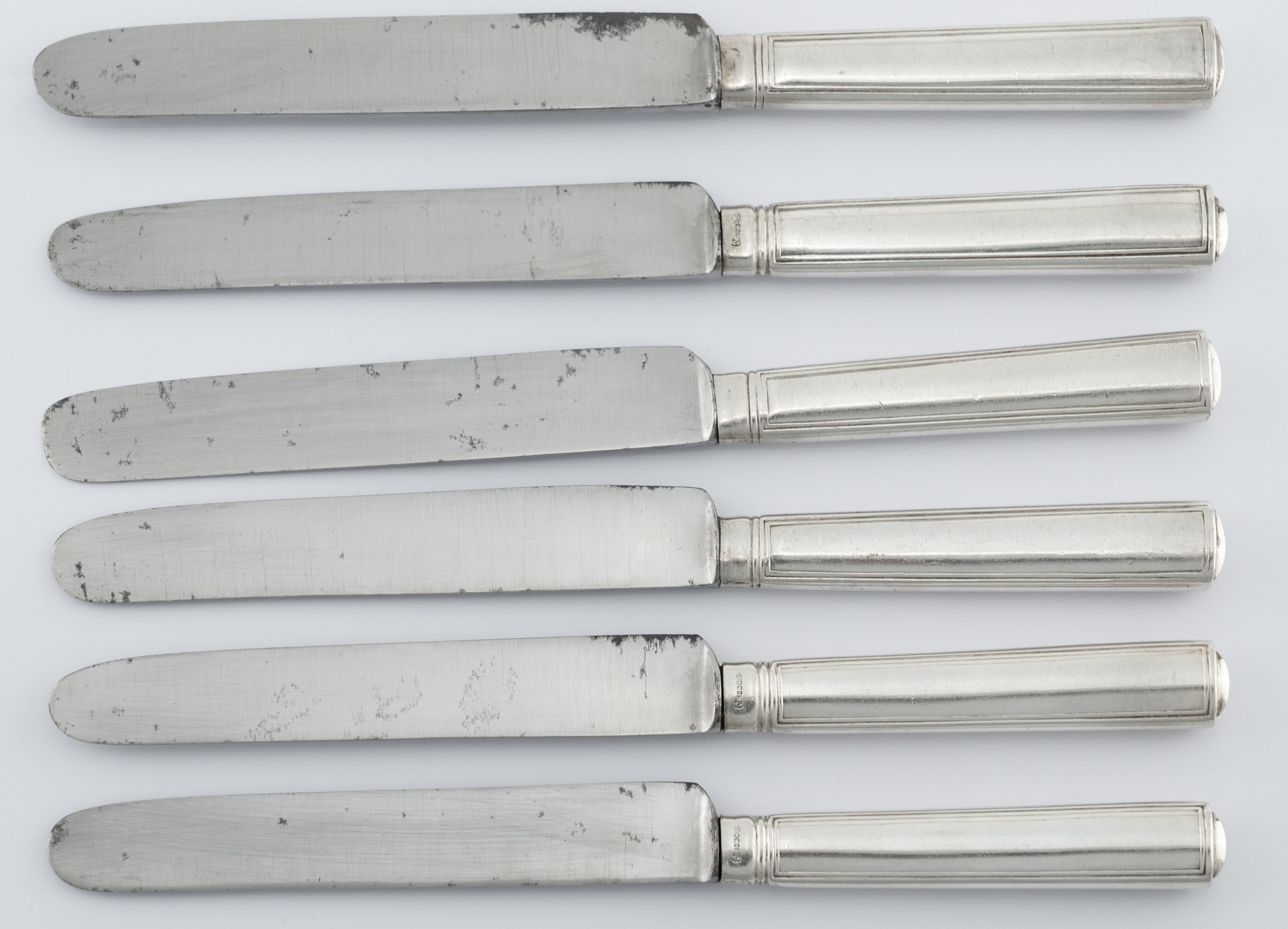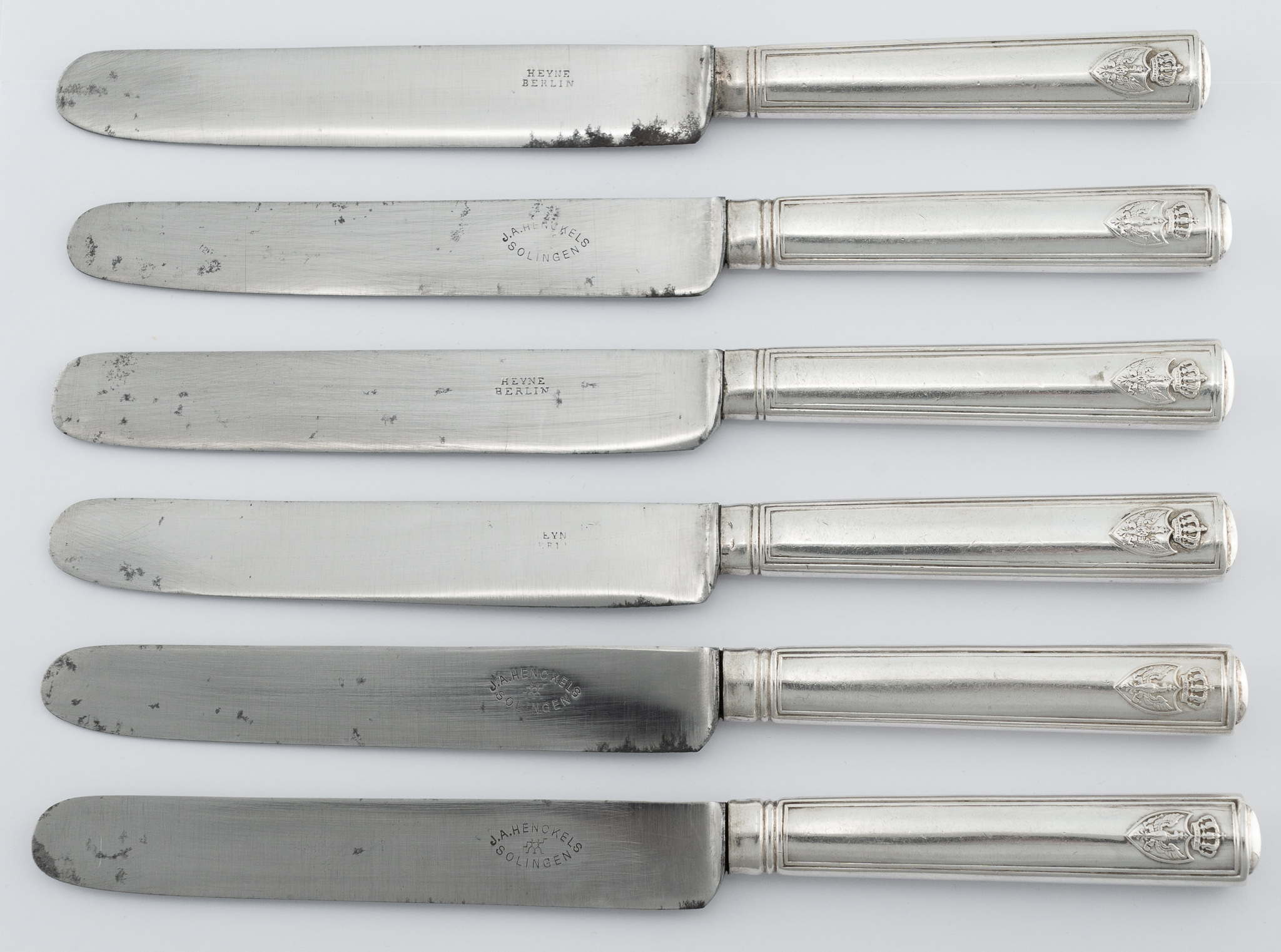 Auf 3 Messern die Meistermarke der Hofjuweliere Körner und Proll Berlin – die anderen nicht mehr lesbar. 800er Silber – Original Stahlklingen (teilweise korrodiert).