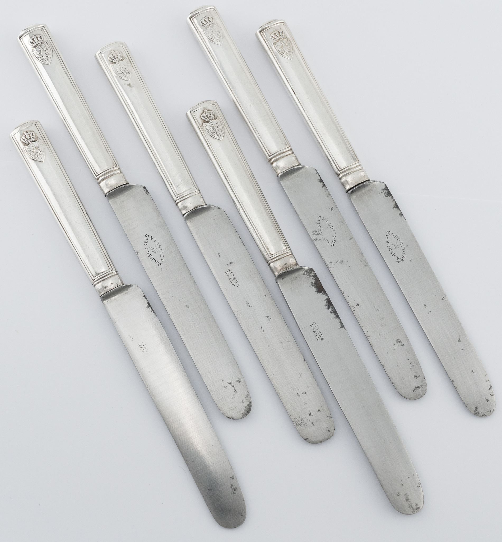 Ein Satz von 6 Kaiserlichen Messern aus dem ehemaligen Besitz Kaiser Wilhelm II. gearbeitet in 800er Silber.