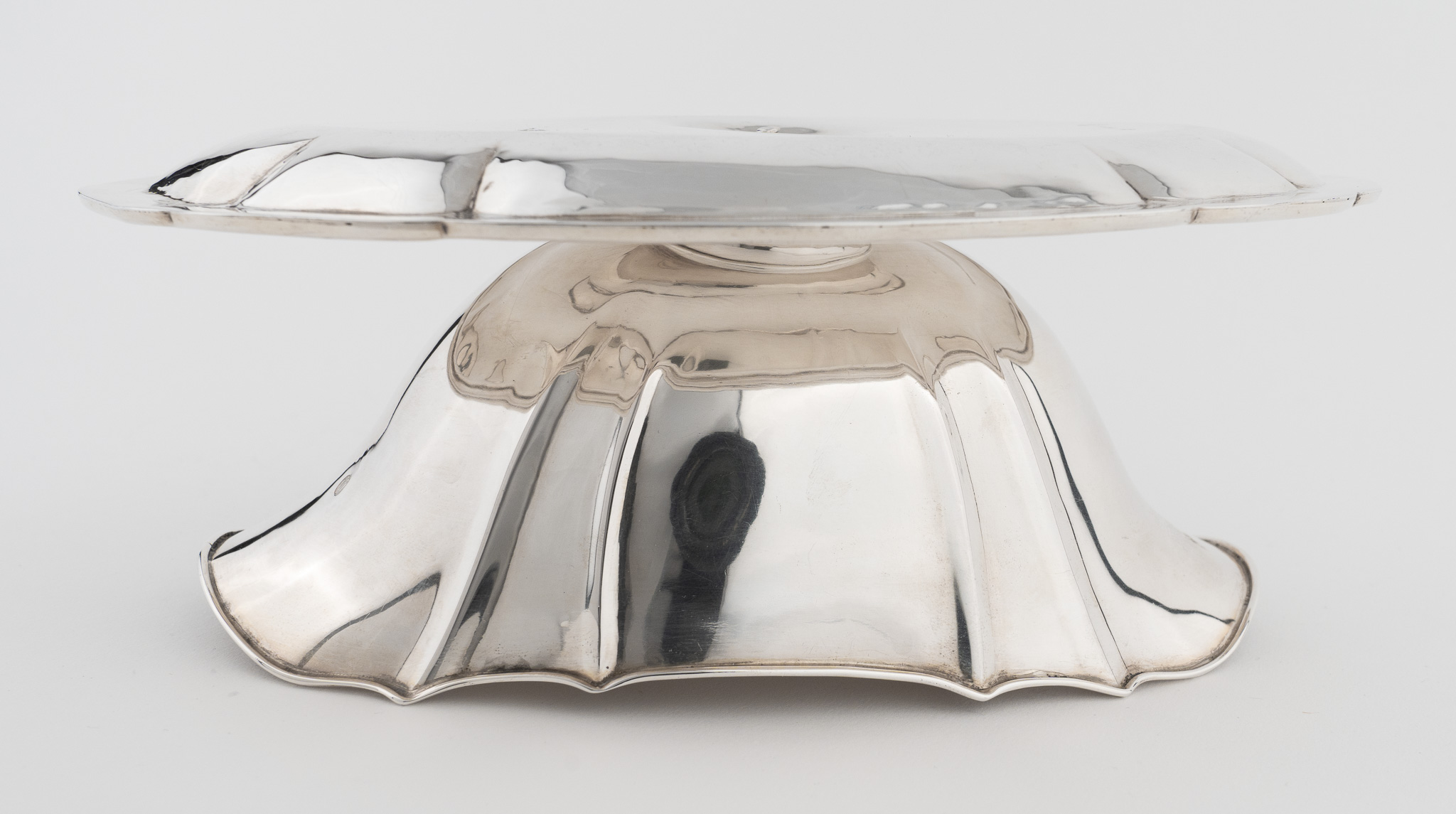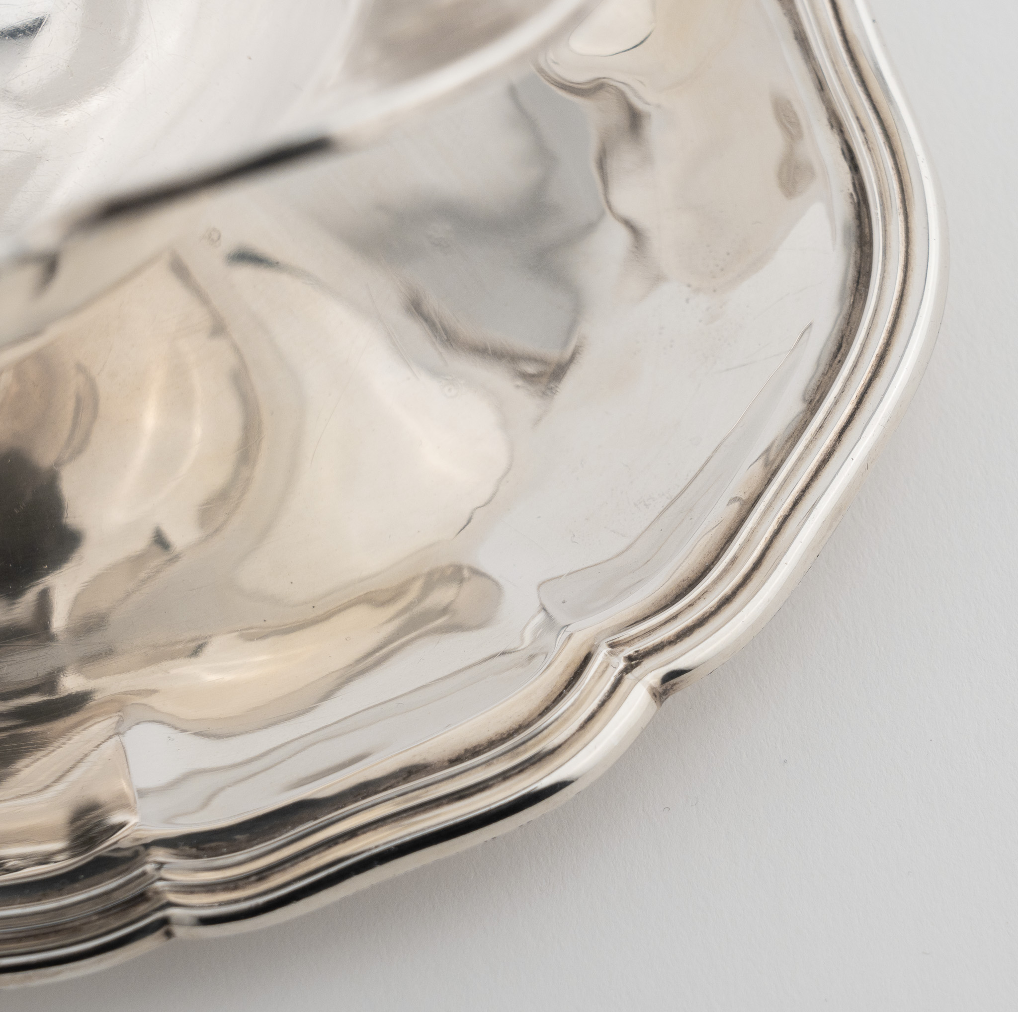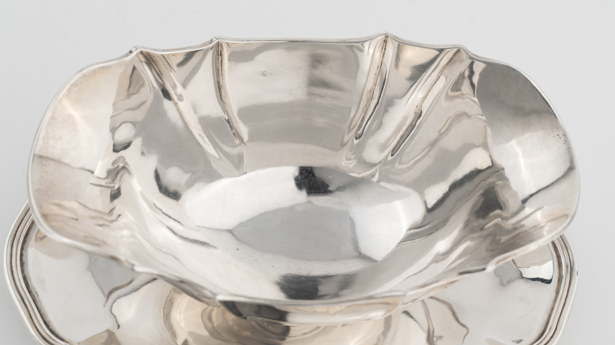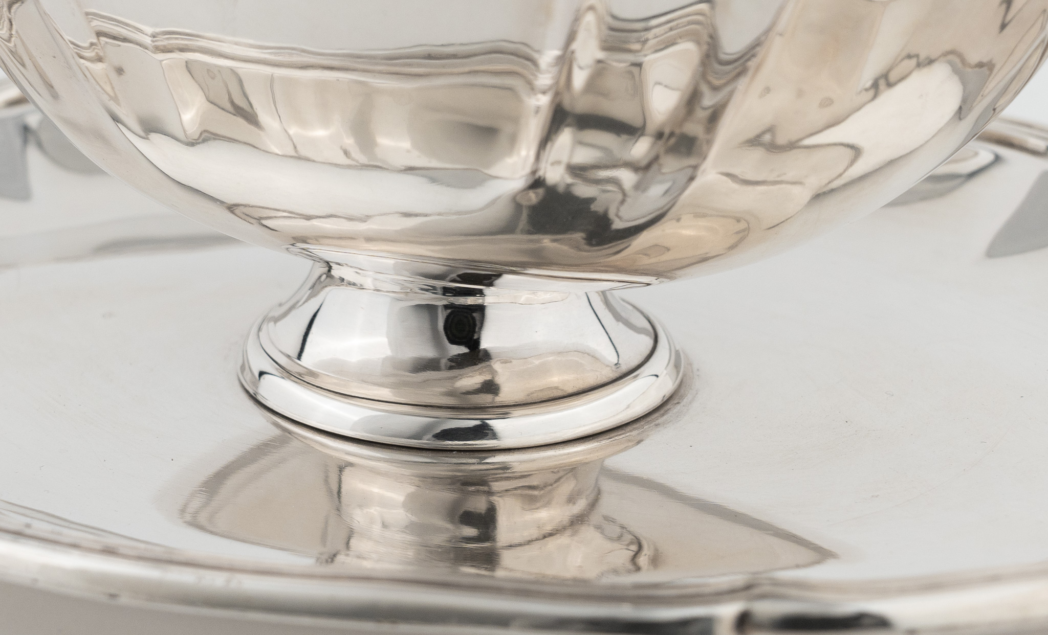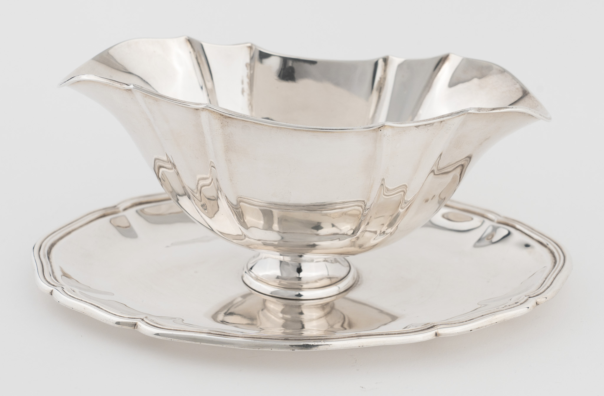 Ovale Sauciere und Unterstand, vierpassig eingezogen. Glatter hochpolierter Dekor.