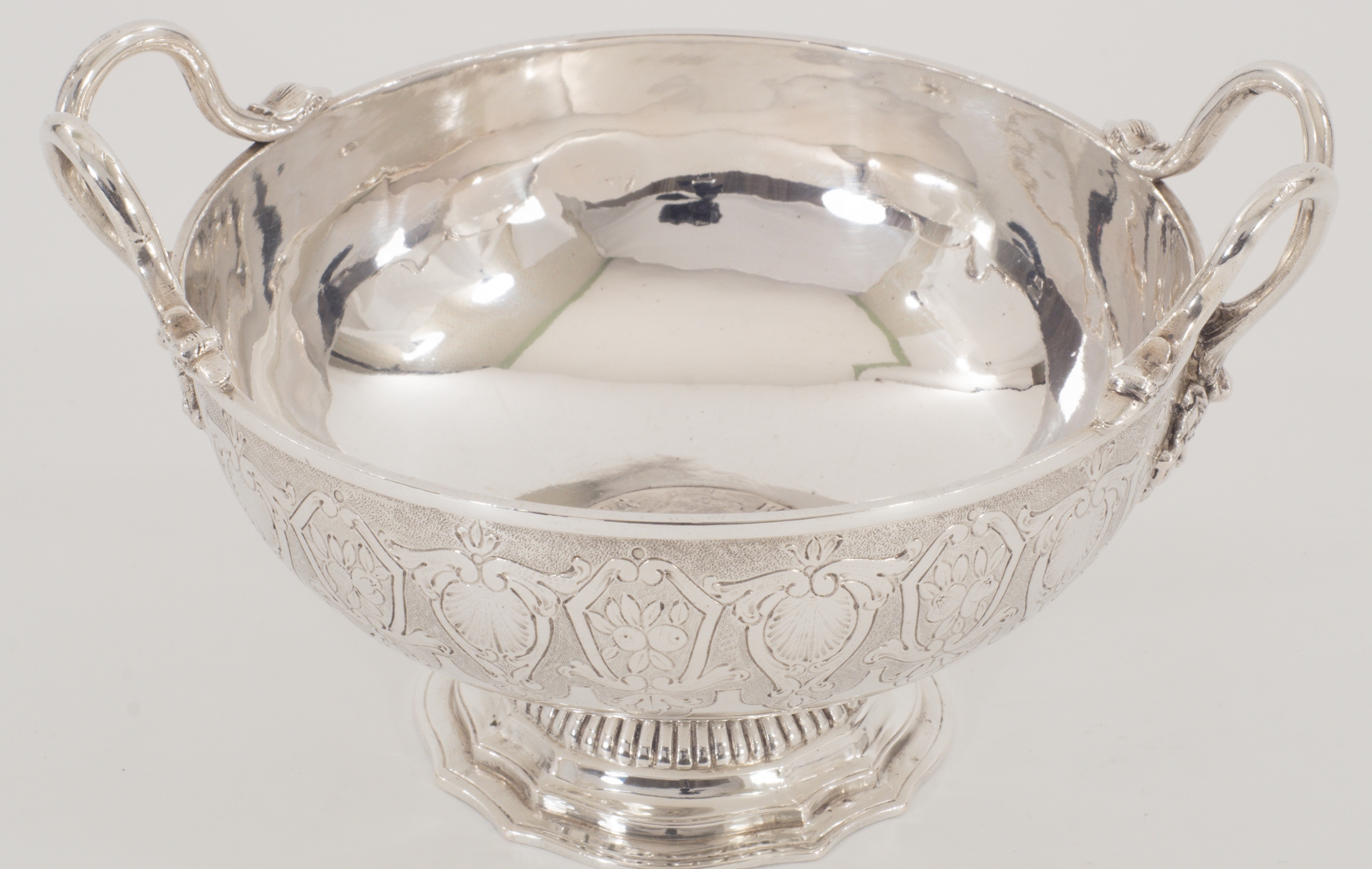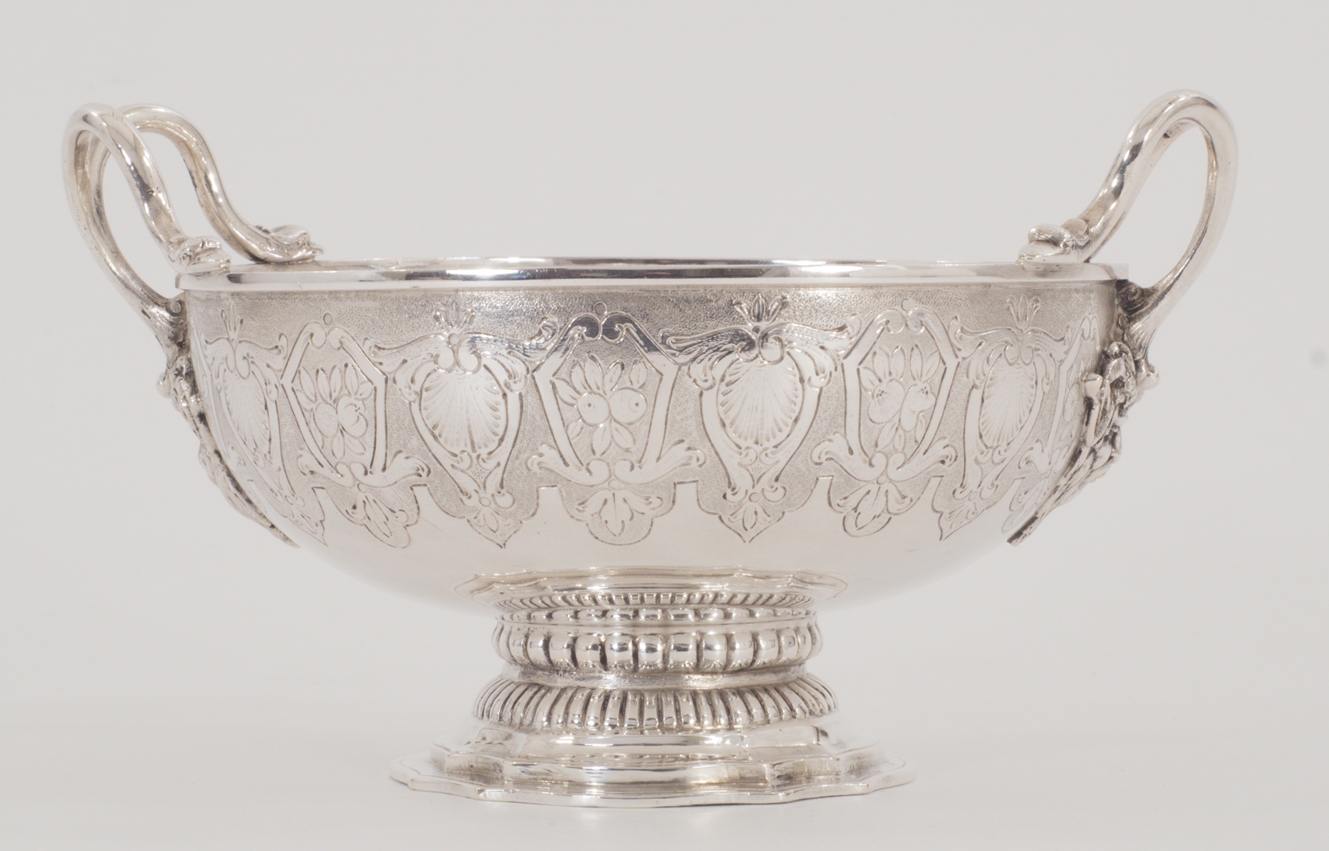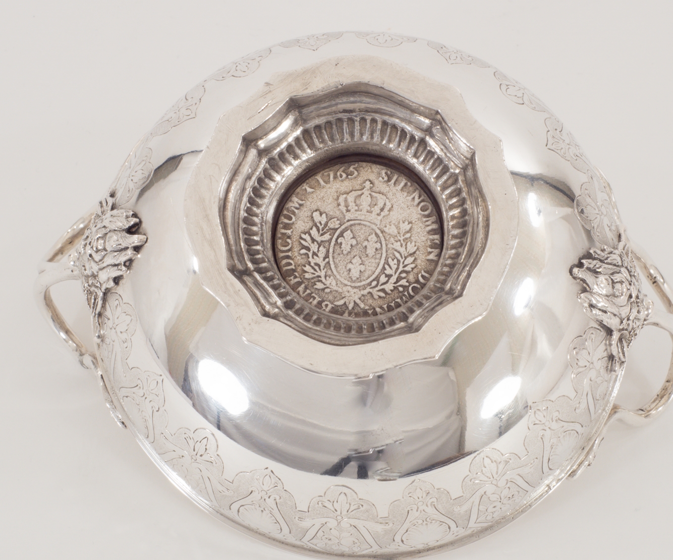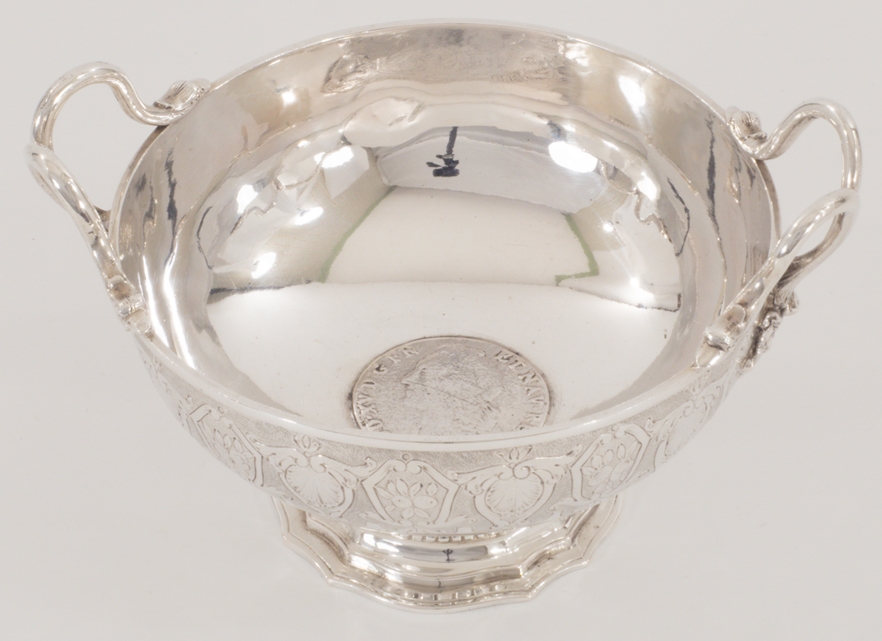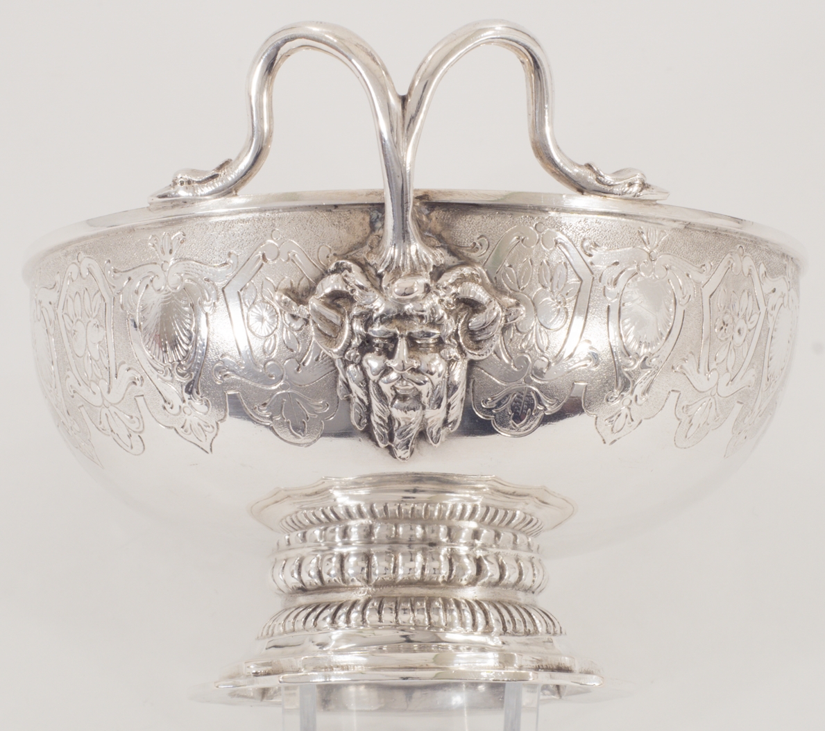 Eine Schale im Stil des Historismus mit Münze, Satyrköpfen und Schwanenhalshenkel