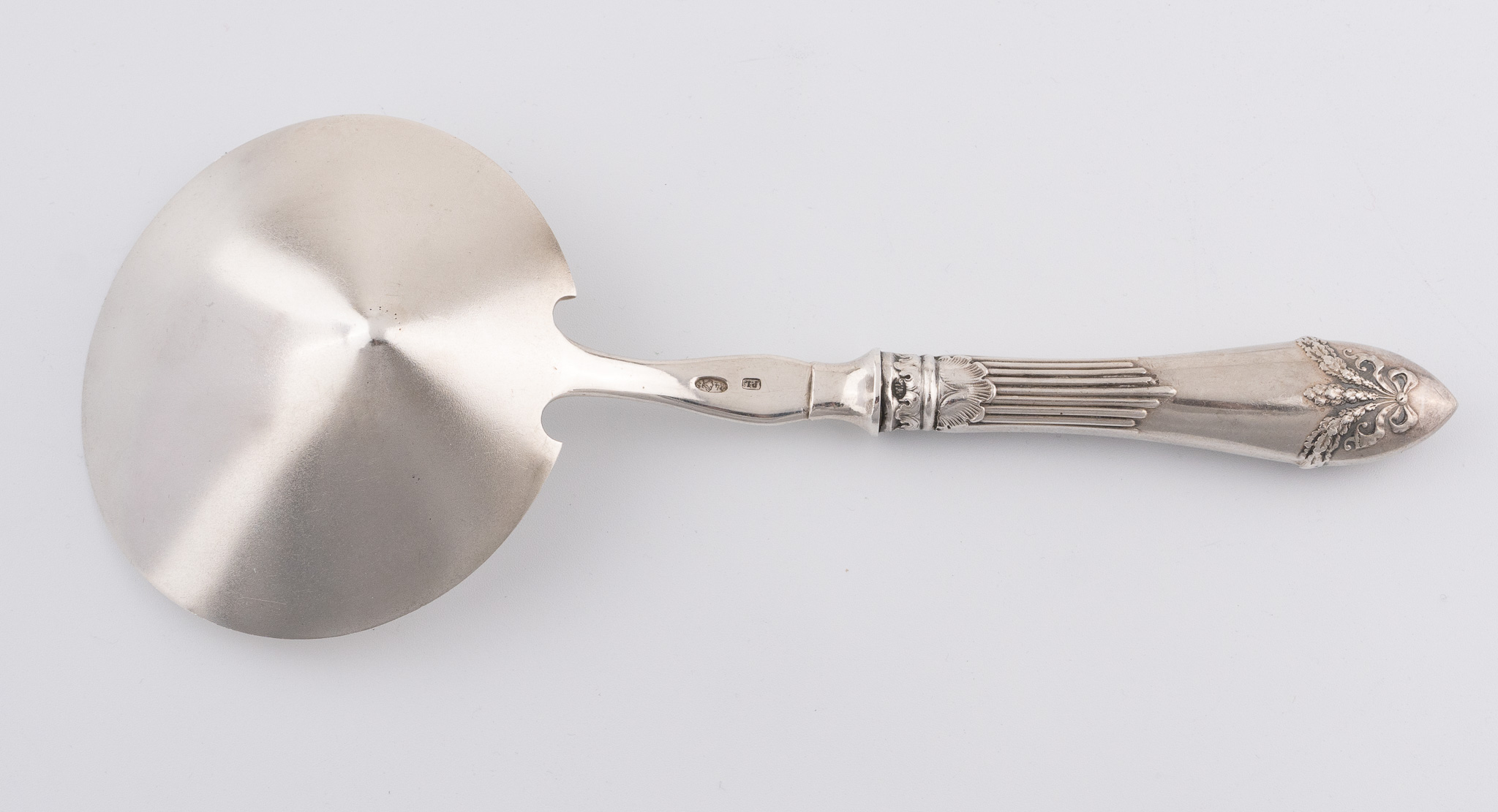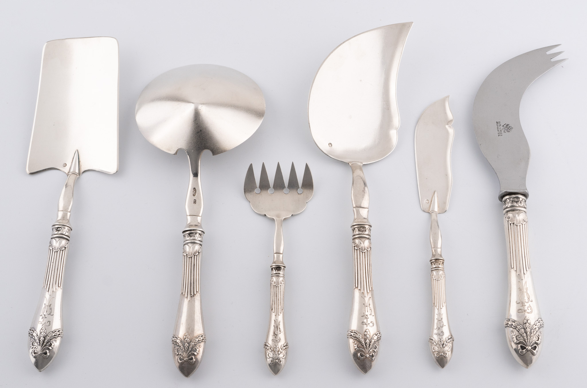 Sechs seltene russische Vorlegeteile Kiew/St. Petersburg 1896/1907 in 84er Zolotniki Silber (875/1000) im Louis-seize Stil