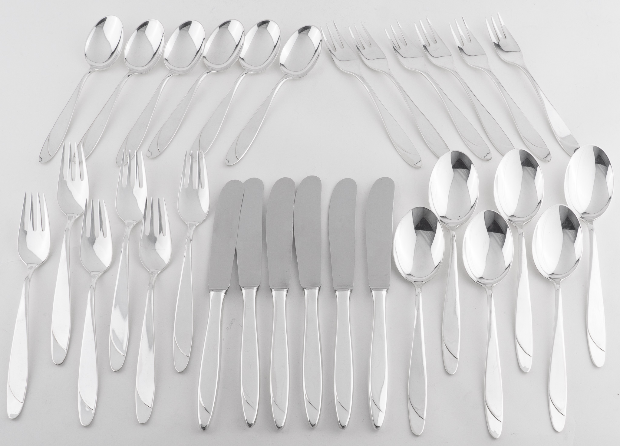Ein 30-teiliges Silberbesteck in 800er Silber bestehend aus einem 18-teiligen Menübesteck sowie 6 Kuchengabeln und 6 Kaffeelöffel. Glatter hochpolierter Dekor.