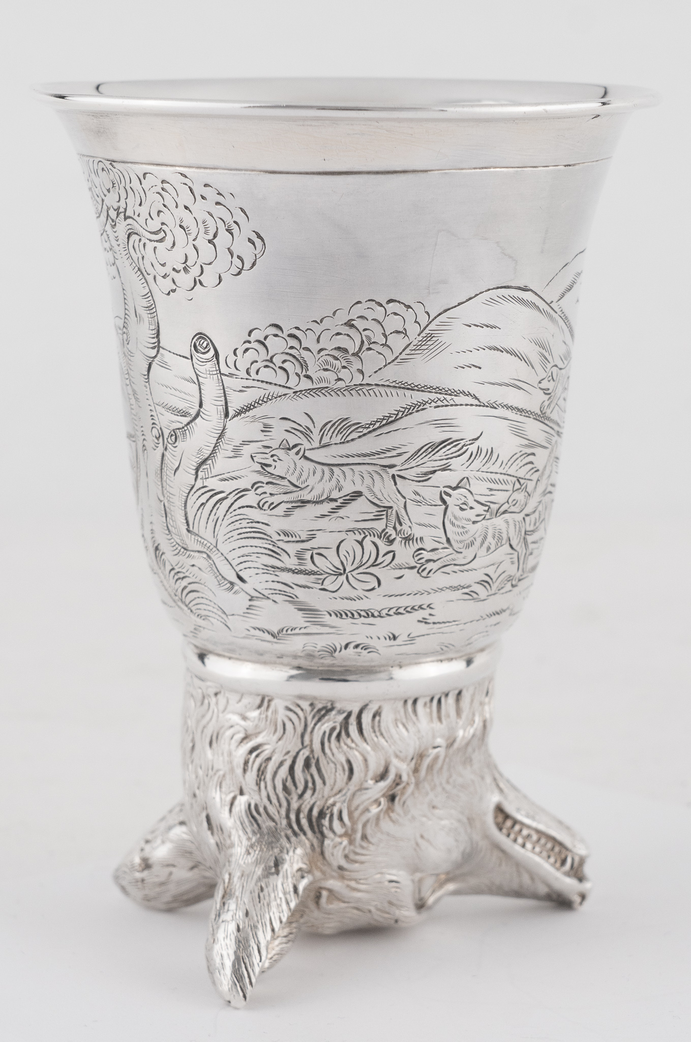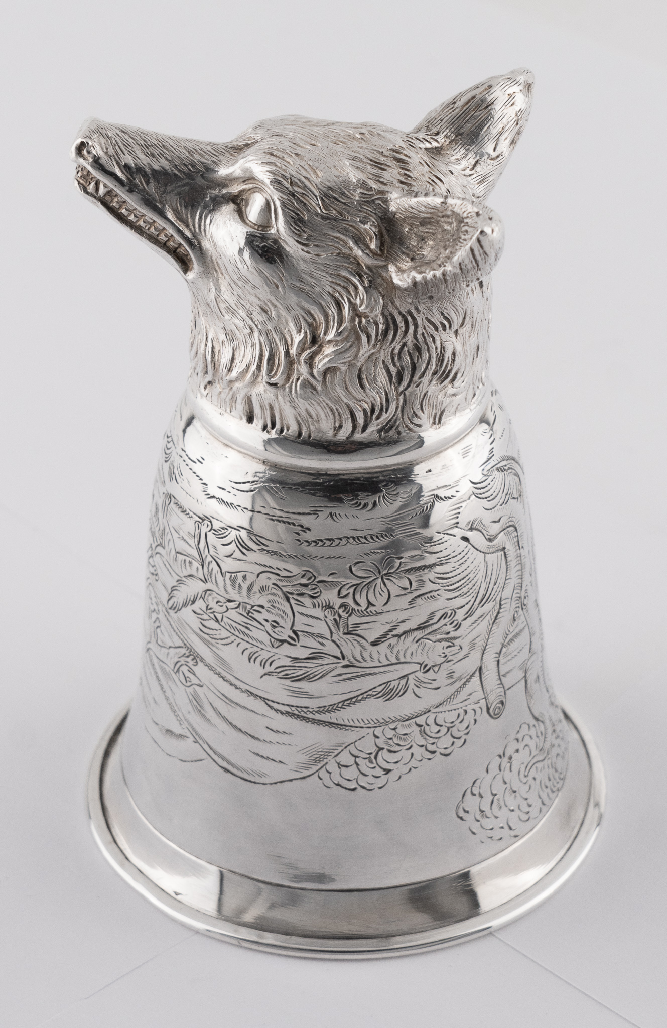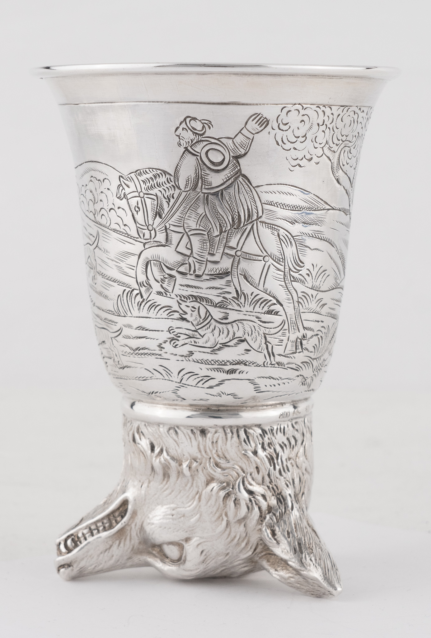 Ein Sturzbecher in 800er Silber mit vollplastischem Wolfskopf und gravierter Jagdszene