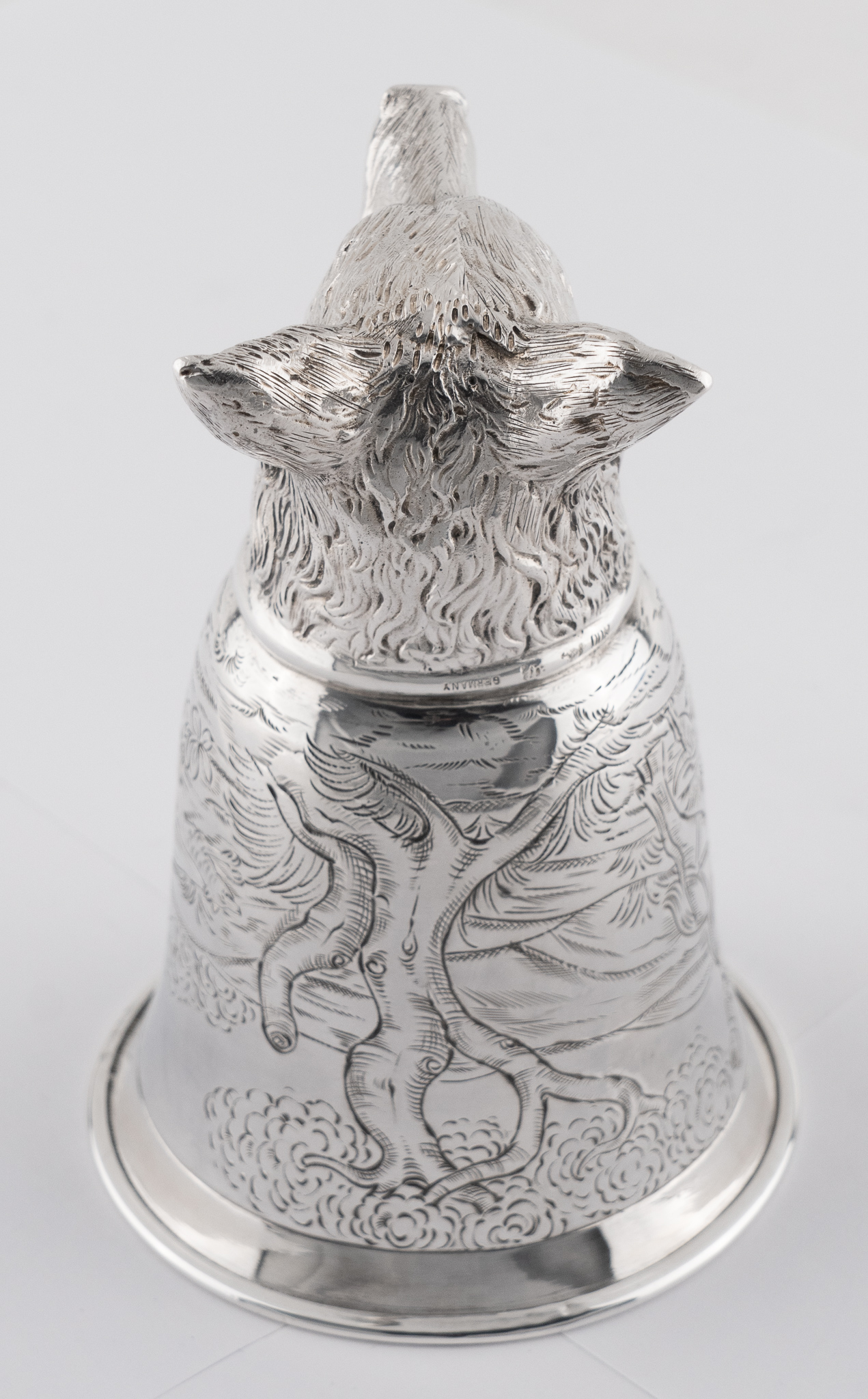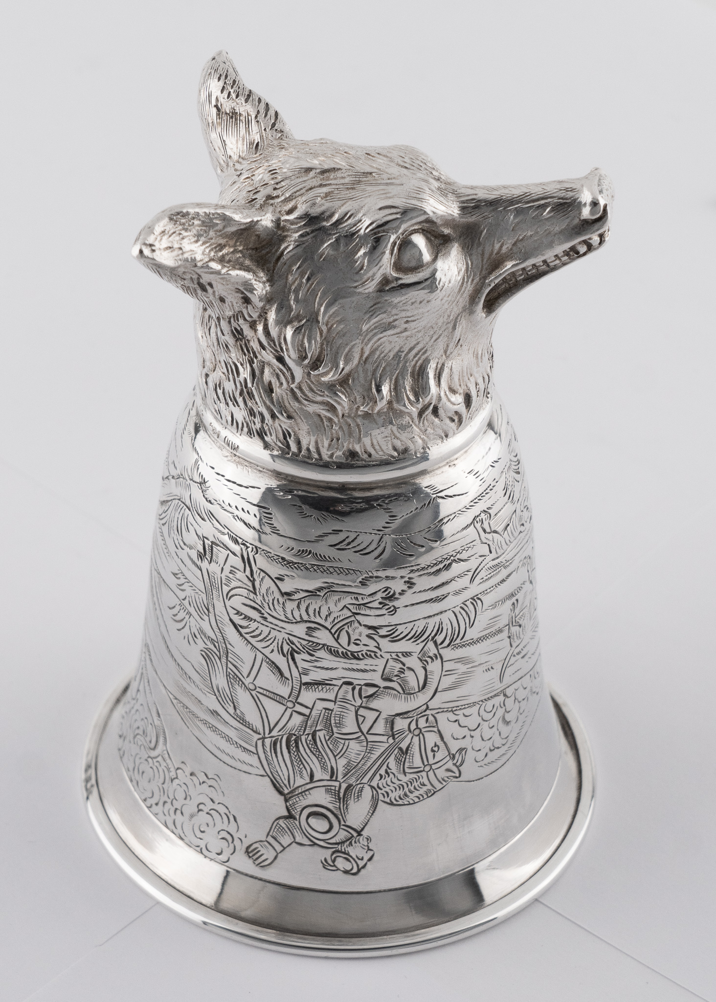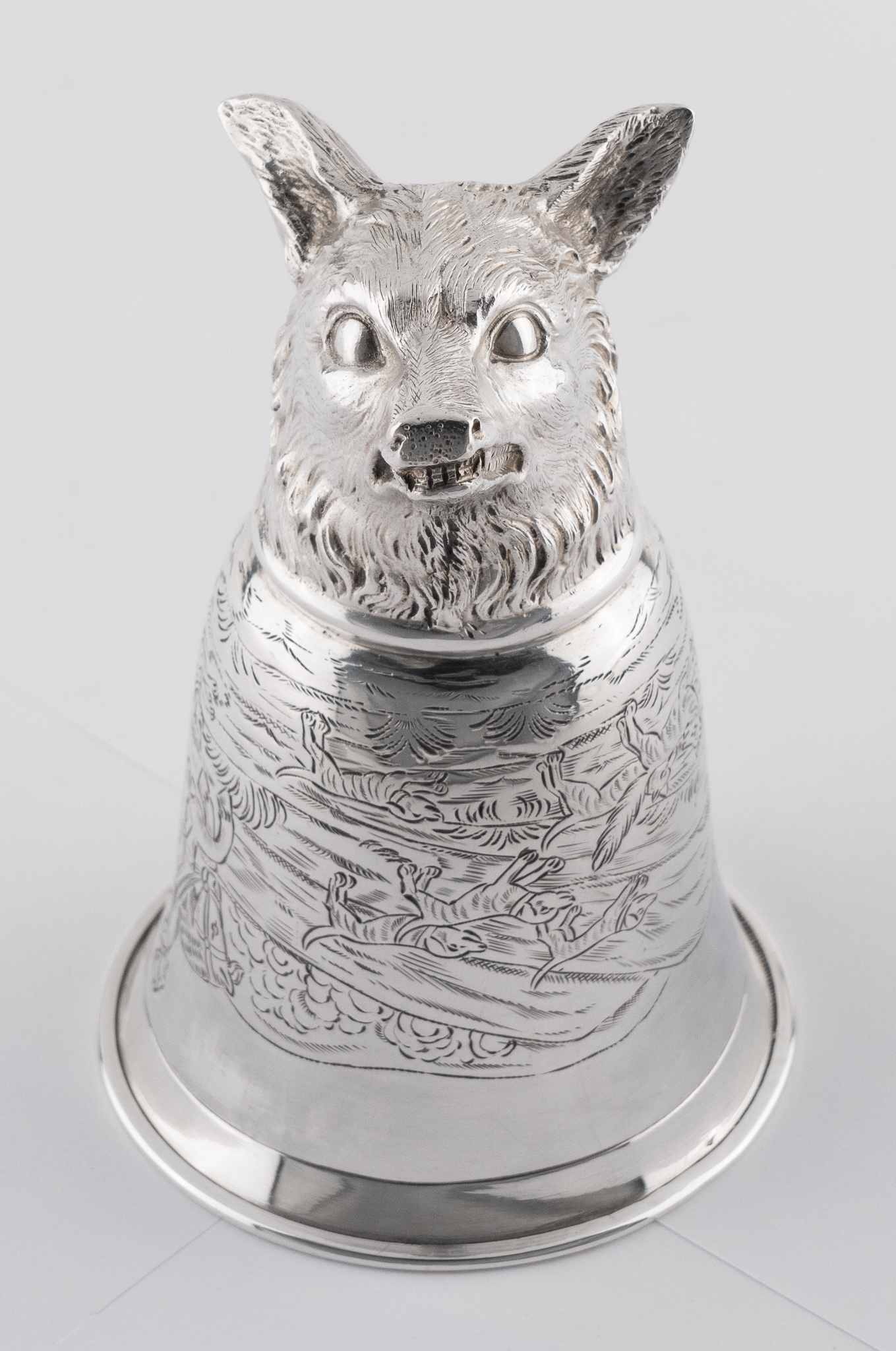 Ein Sturzbecher in 800er Silber mit vollplastischem Wolfskopf und gravierter Jagdszene