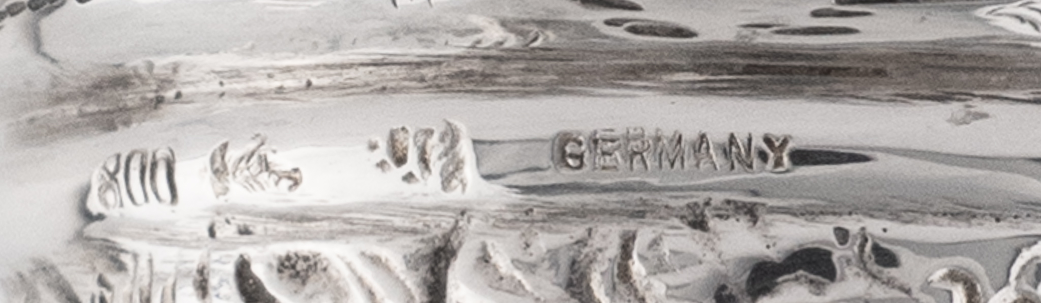 Ein Sturzbecher in 800/1000 Silber mit vollplastisch gearbeitetem Wolfskopf und umlaufend fein gravierter Jagdszene. Deutschland, wohl Hanau – 1. Hälfte 20. Jahrhundert.