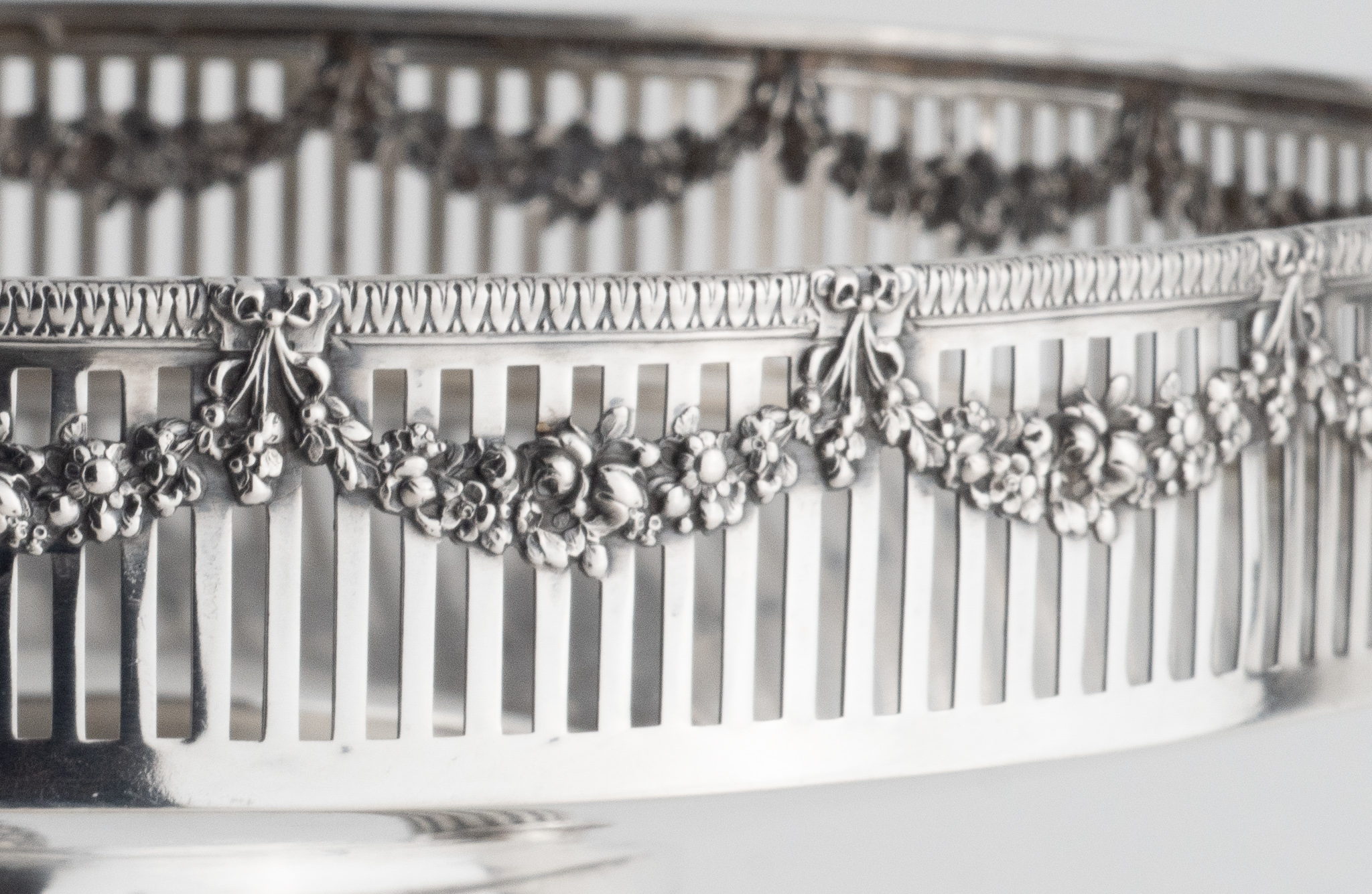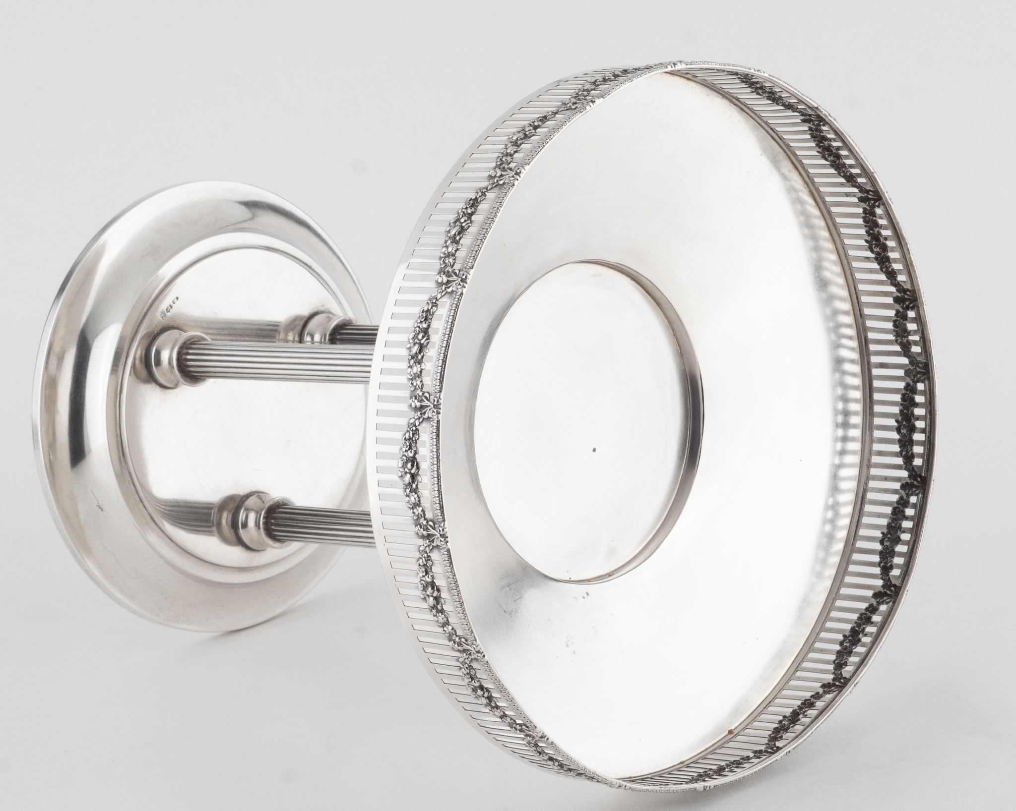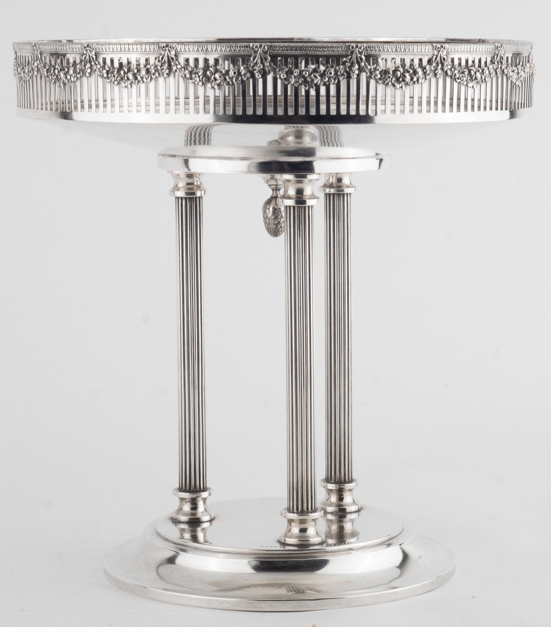 Ein dekorativer Tafelaufsatz, Historismus im Stil des Klassizismus, mit 3 kannelierten Säulen. Glatter hochpolierter Dekor. Durchbrochen gearbeitet und umlaufend mit Blumengirlanden verziert.