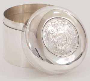 Eine runde Deckeldose mit einer 30 Tari Münze des Malteserordens von 1761 - VERKAUFT