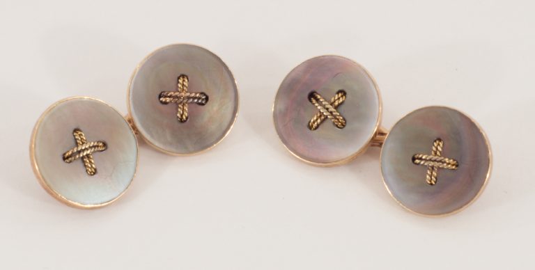 Ein Paar doppelte Manschettenknöpfe in 14 Karat Rotgold mit dunklen Perlmutt-Einlagen - VERKAUFT
