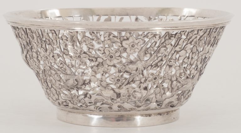 Eine feine Konfektschale aus Shanghai in Silber mit Blumen und Vögeln - VERKAUFT