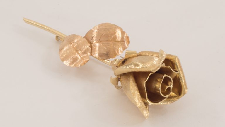 Eine Brosche in Form einer plastisch gearbeiteten Rose, 18 Karat Gelb und Rosegold - VERKAUFT