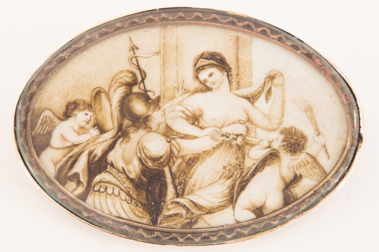Eine feine klassizistische Brosche mit antiker Szene in Grisaille Malerei, 14 Karat Gelbgold - VERKAUFT