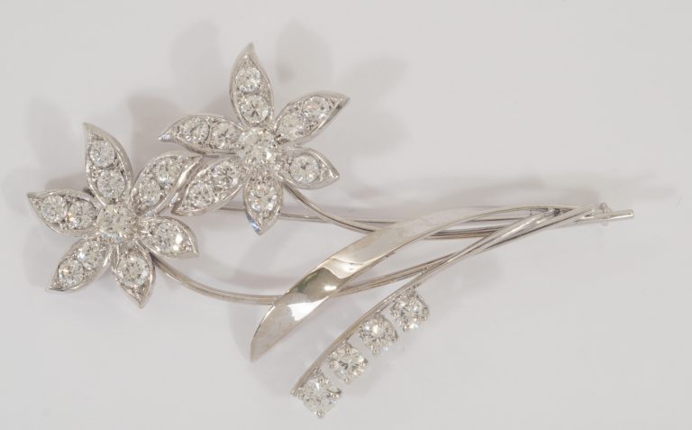 Eine Brosche in 18 Karat Weißgold in Form eines Blütenzweiges, 26 Brillanten zus. ca. 3,7 ct - VERKAUFT