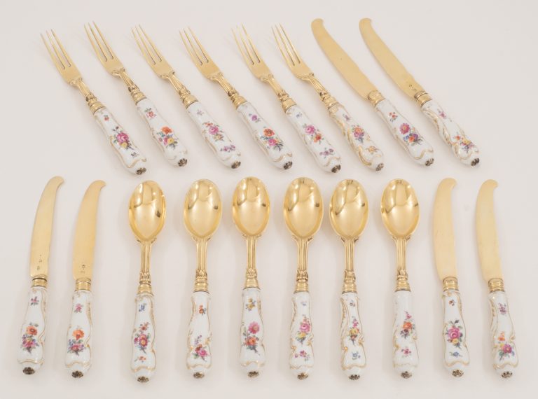 Ein außergewöhnliches 18 teiliges Dessertbesteck, Silber und vergoldet mit fein bemalten Porzellangriffen Berlin ca. 1780 - VERKAUFT