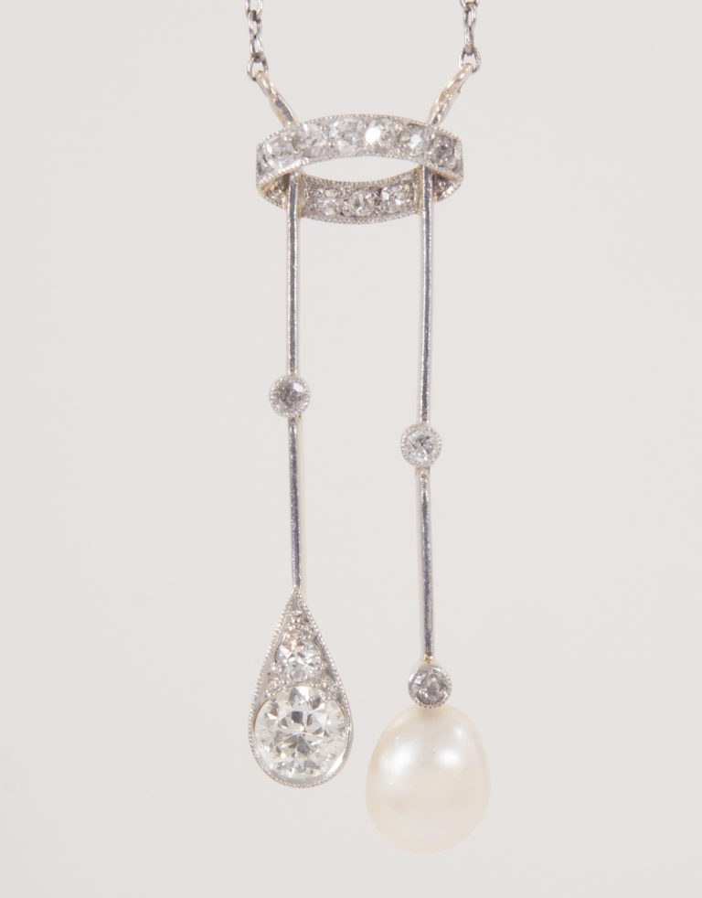 Ein feines Collier-Negligé - gearbeitet in 14 Kt. Gelbgold und Platin - mit Diamanten und Naturperle. um 1910 - VERKAUFT