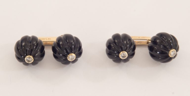 Ein Paar Tiffany & Co Manschettenknöpfe in 14 Karat Gelbgold mit Onyx und Diamanten - VERKAUFT
