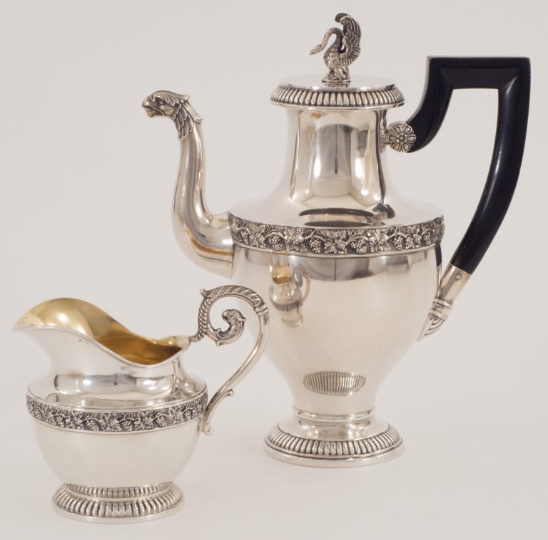 Eine solide Kaffeekanne und Milchkännchen im Empire-Stil, 800er Silber, Deutschland - VERKAUFT