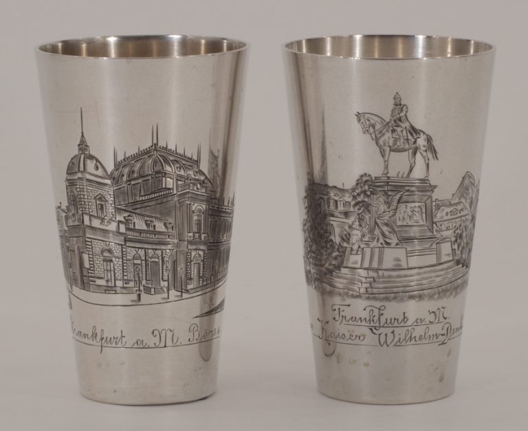 Zwei Silberbecher in 800er Silber mit sehr fein gravierten Frankfurter Motiven - VERKAUFT