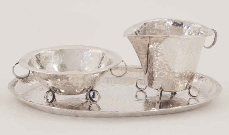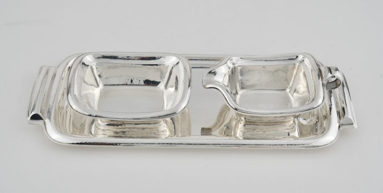 Ein Zucker und Sahne Set auf Tablett - 835er Silber - Hammerschlagoptik - VERKAUFT