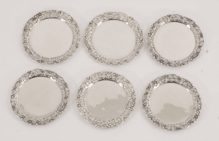 Ein Satz von 6 Glasuntersetzern in 800 & 835er Silber - durchbrochen gearbeitet - floraler Dekor​ - VERKAUFT