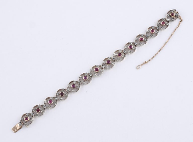 Ein Armband in 18 Kt Gelbgold und Silber durchbrochen gearbeitet mit 14 Rubinen von ca. 2 ct. und 73 Diamanten von zusammen c. 1,7 ct - VERKAUFT