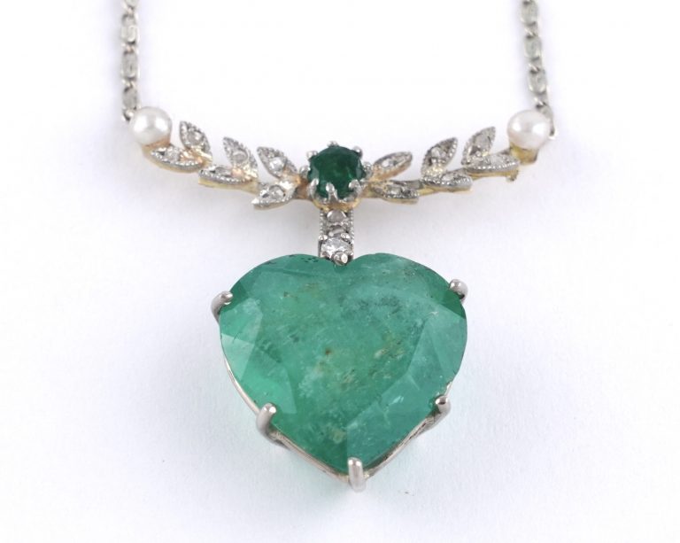 Ein in Platin gefasster Smaragdanhänger mit einem herzförmigen facettierten brasilianischen Smaragd von ca. 7,5 ct. - VERKAUFT