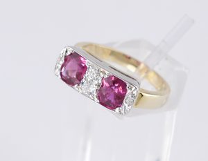 Ein Rubinring in 14 Karat Gold mit 2 ovalen Rubinen und 4 Altschliff-Diamanten - VERKAUFT