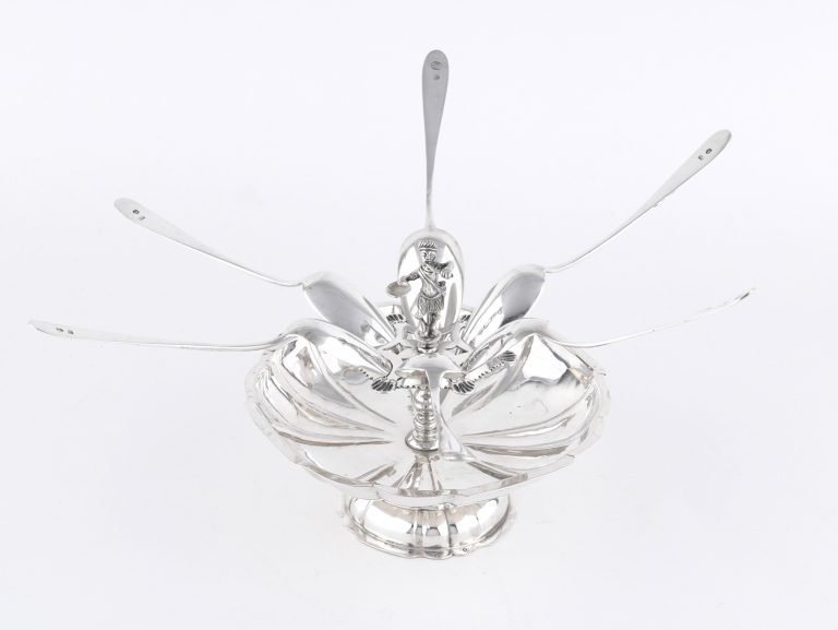 Eine seltene barocke Zuckerschale in Silber mit Löffelhalter und 6 Löffeln - VERKAUFT