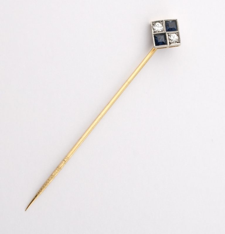Eine quadratische Art déco Krawattennadel in 18 Gelbgold mit 2 Altschliff Diamanten und 2 Saphir-Carrés - VERKAUFT