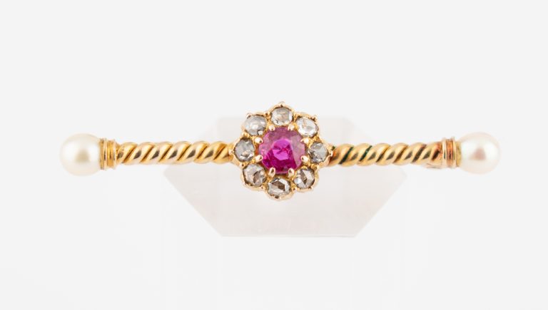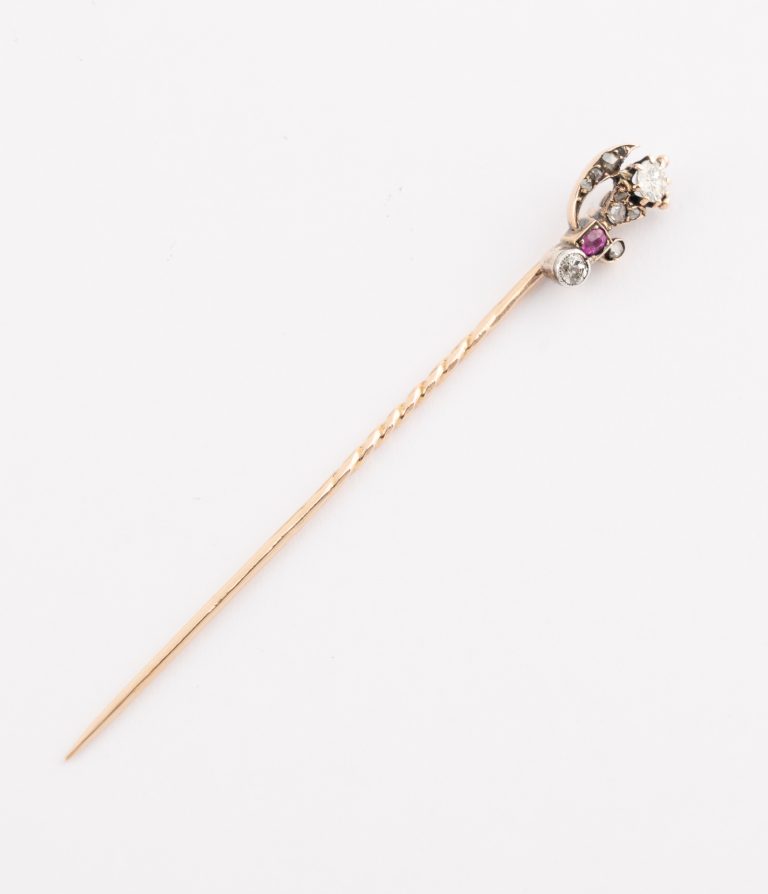 Eine aparte Stabnadel in 14 Karat Gelbgold mit einem Rubin und Diamanten - VERKAUFT