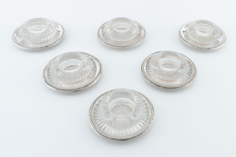 Ein Satz von 6 Salznäpfen um 1860 - Kristallglas mit 12-löthigen Silberteller - Wappen Schaumburg-Lippe - VERKAUFT
