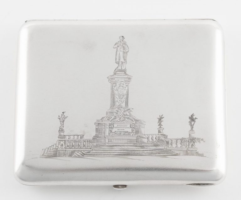 Ein Zigarettenetui in 84er Silber mit dem fein gravierten Adam-Mickiewicz-Denkmal in Warschau - VERKAUFT