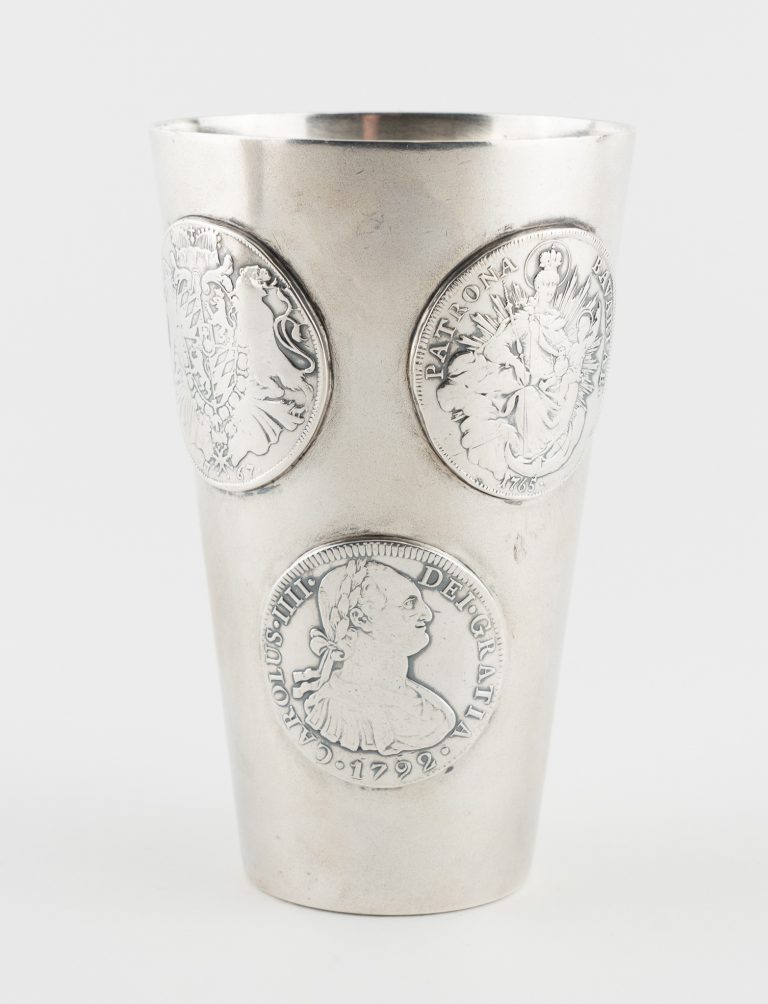 Ein Münzbecher in 800er Silber mit 3 Münzen aus dem 18. Jahrhundert - VERKAUFT