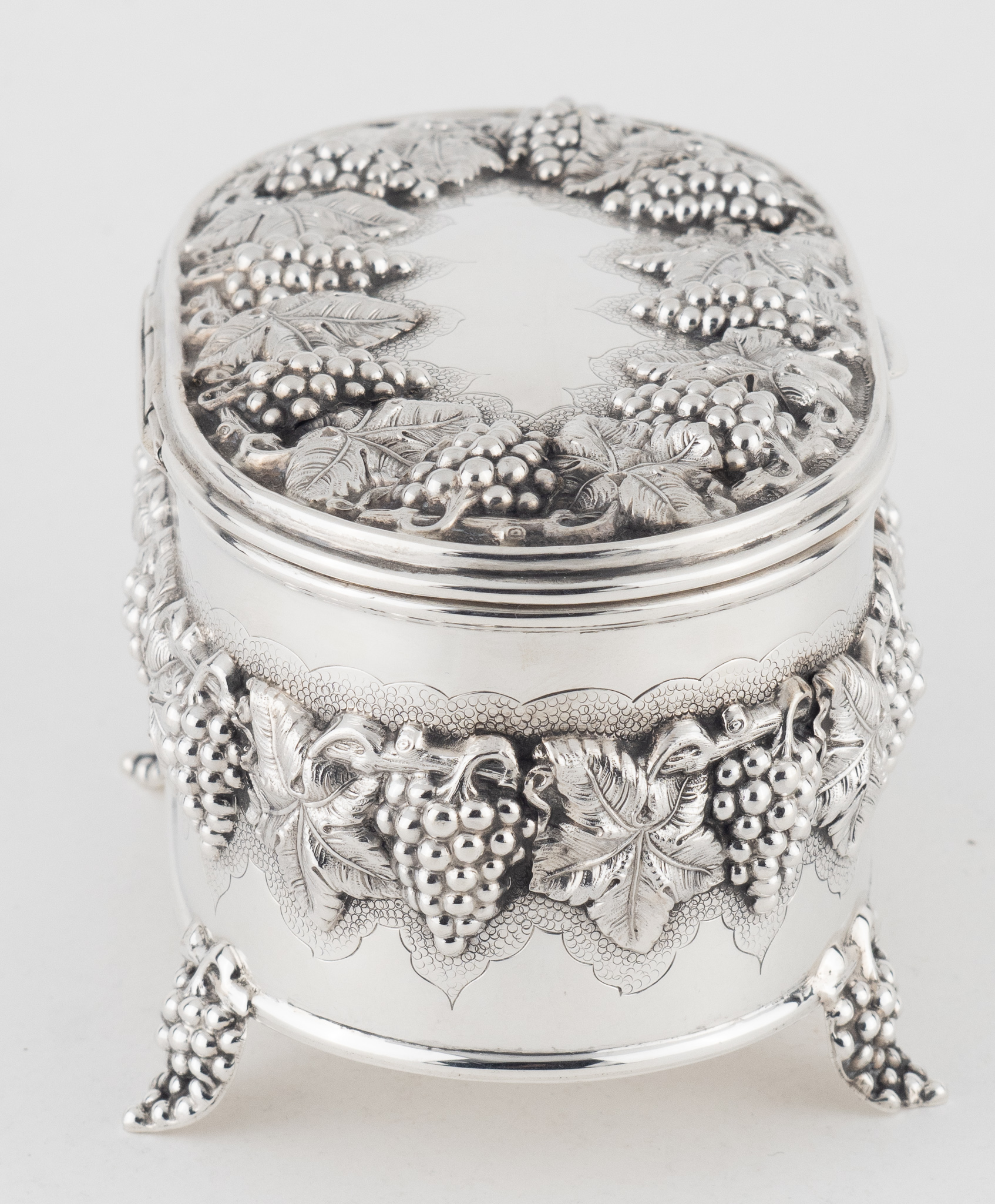 Eine solide Zuckerdose gearbeitet in 925/1000 Sterlingsilber. Glatter hochpolierter Dekor, umlaufend verziert mit halbplastischem Weinlaub und Trauben. Innenvergoldung.
