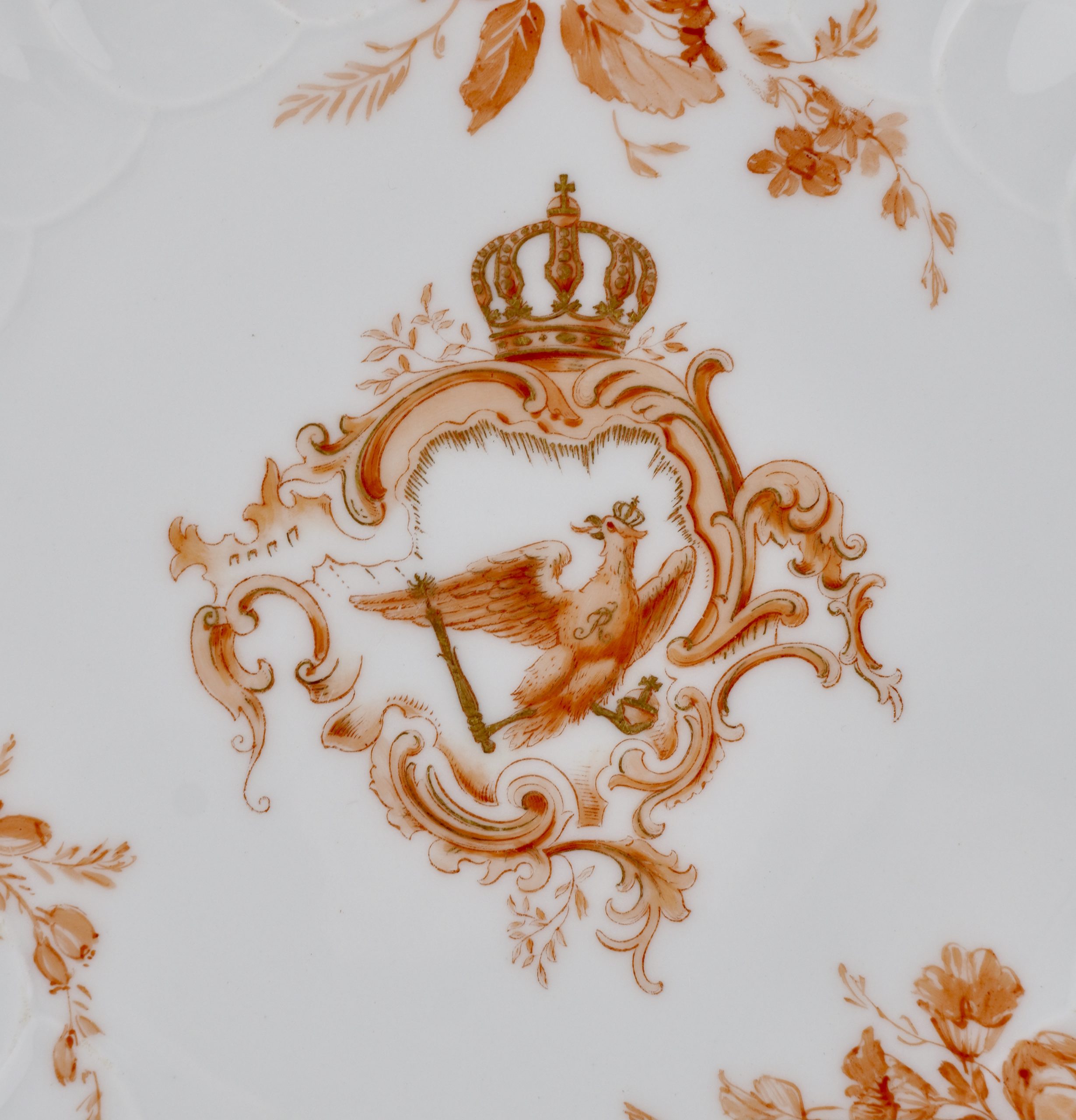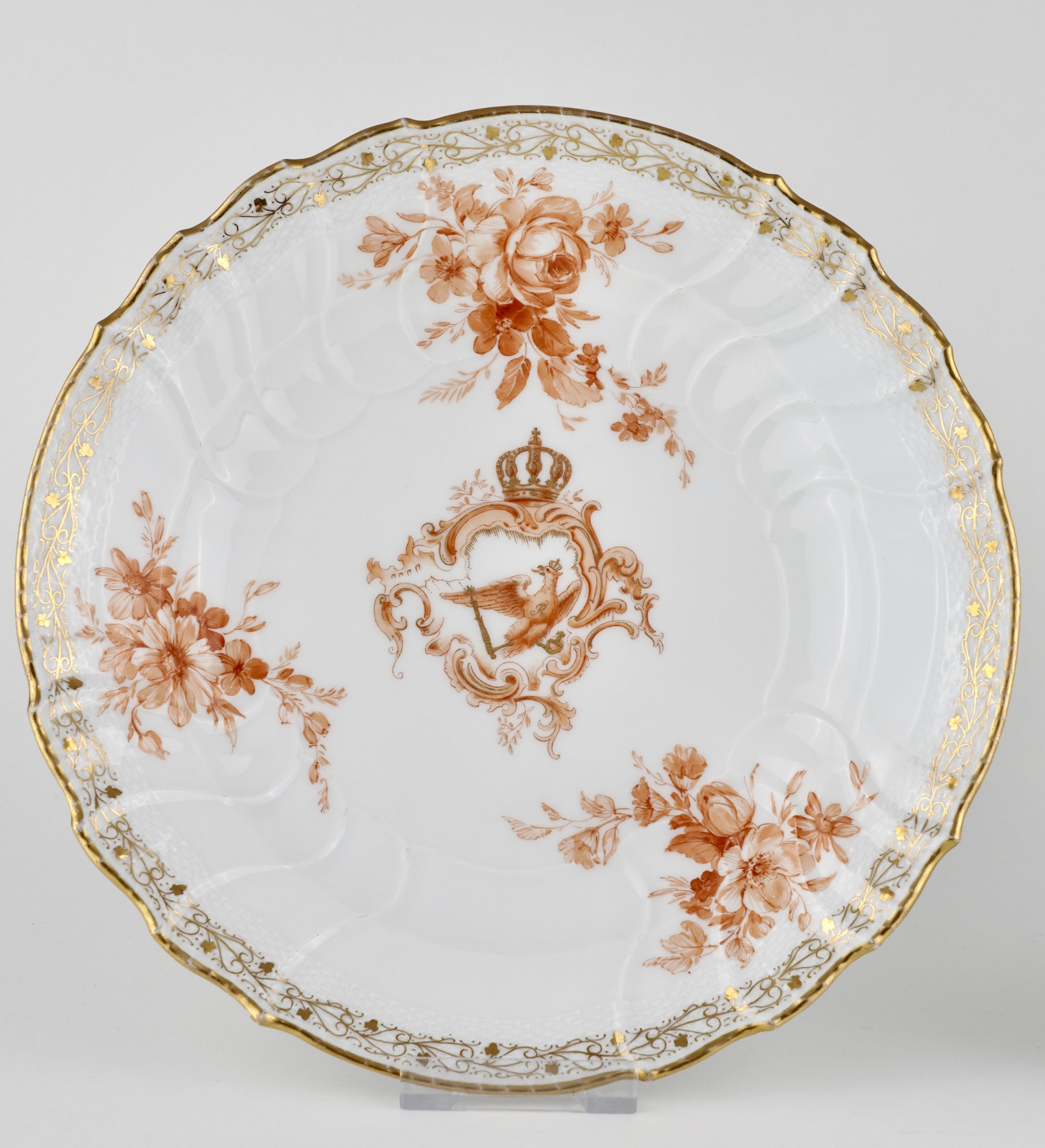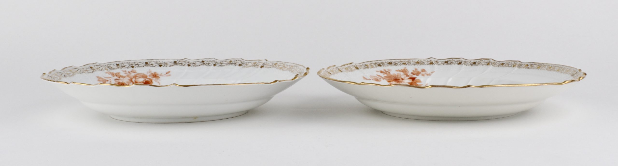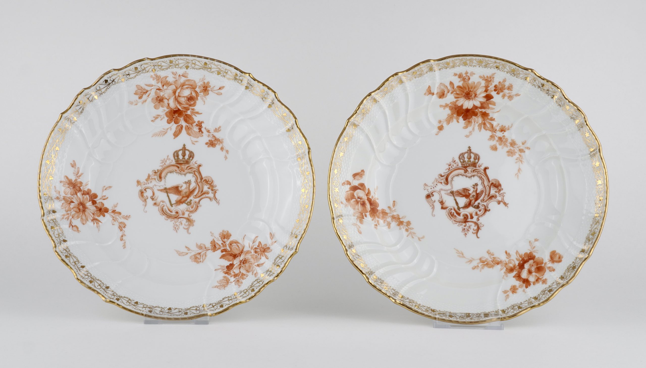 Zwei Neuosier-Speiseteller aus einem Service für Kaiser Wilhelm II. in Eisenrot, mit dem bekrönten preussischen Adler, 3 Blumenbuketts und goldenem Weinlaubrand.