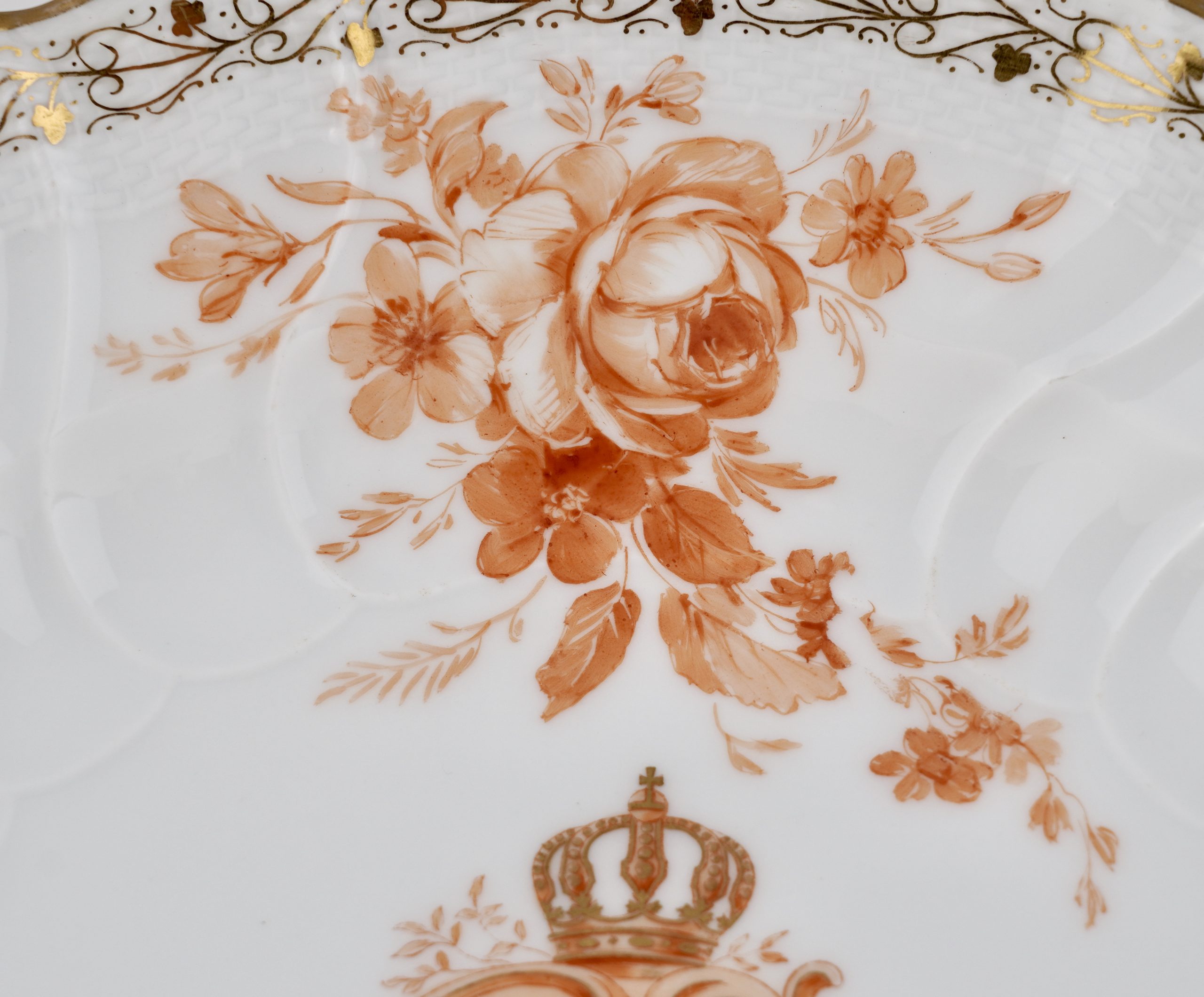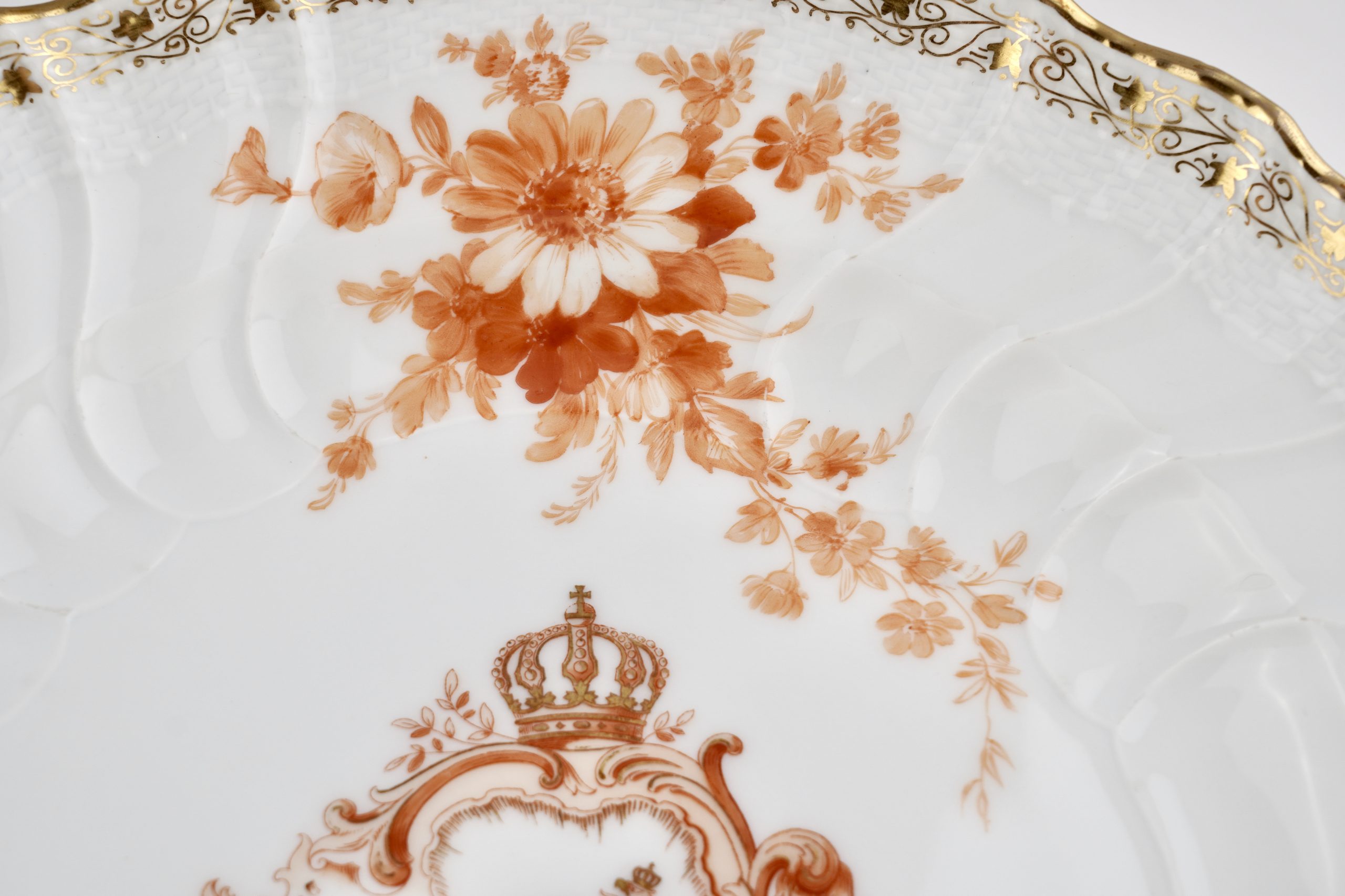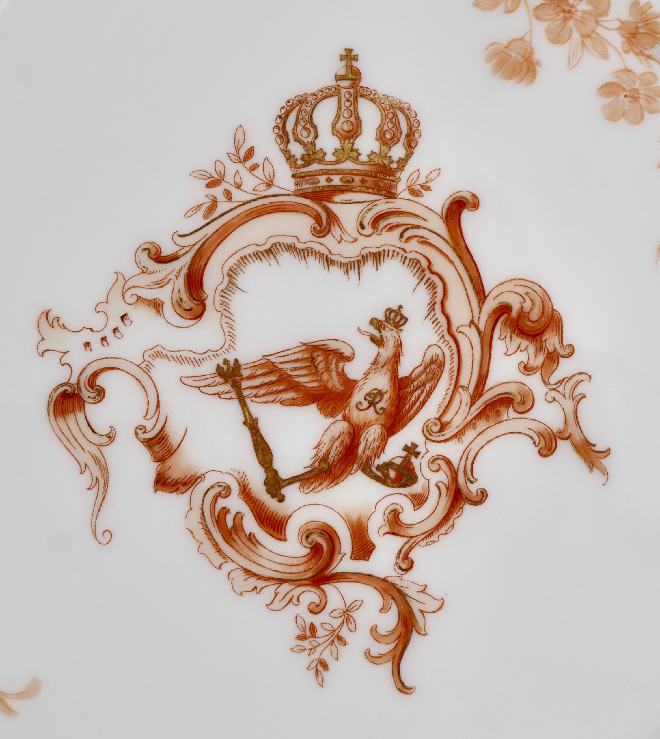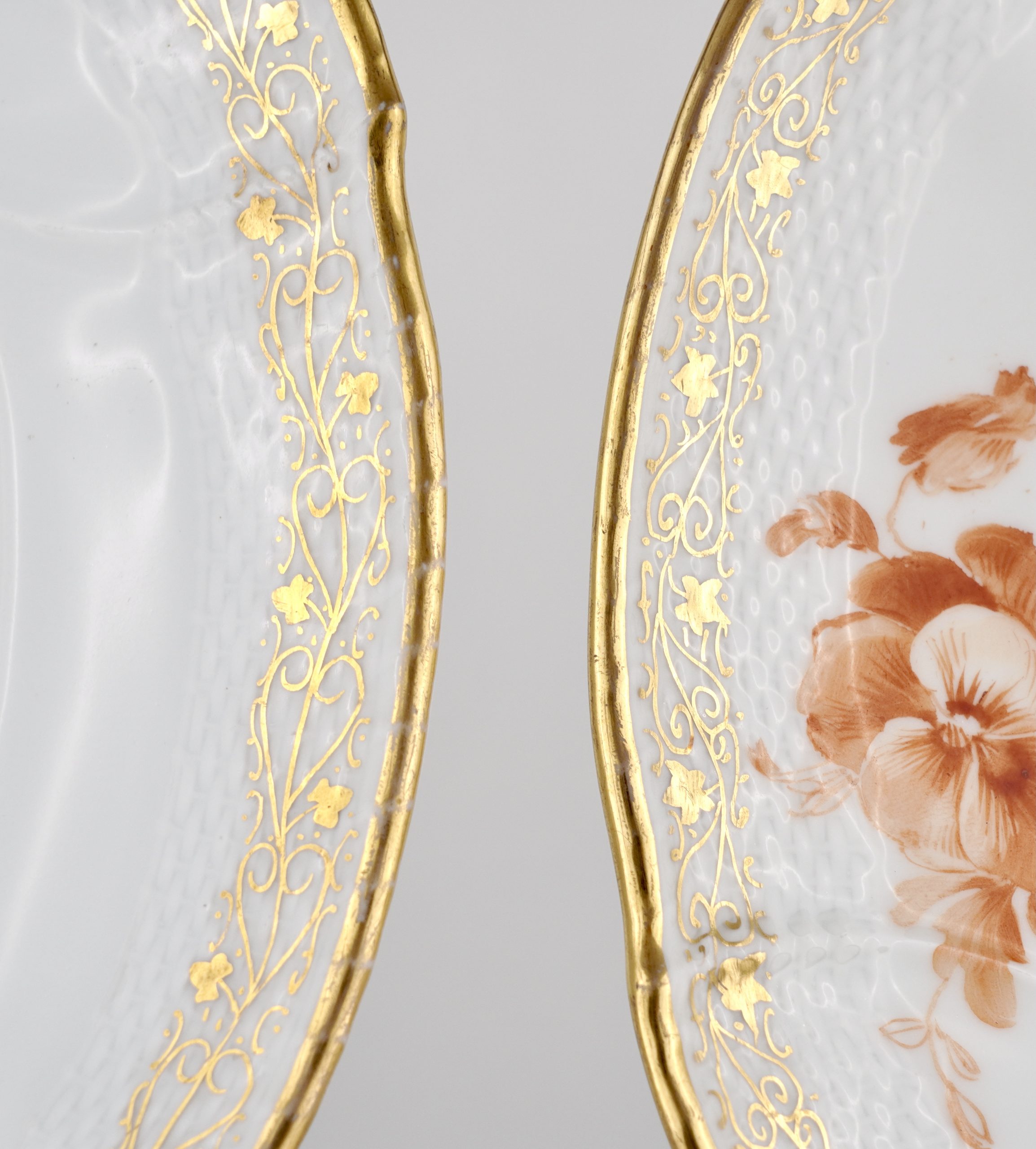 Zwei Neuosier-Speiseteller aus einem Service für Kaiser Wilhelm II. in Eisenrot, mit dem bekrönten preussischen Adler, 3 Blumenbuketts und goldenem Weinlaubrand.